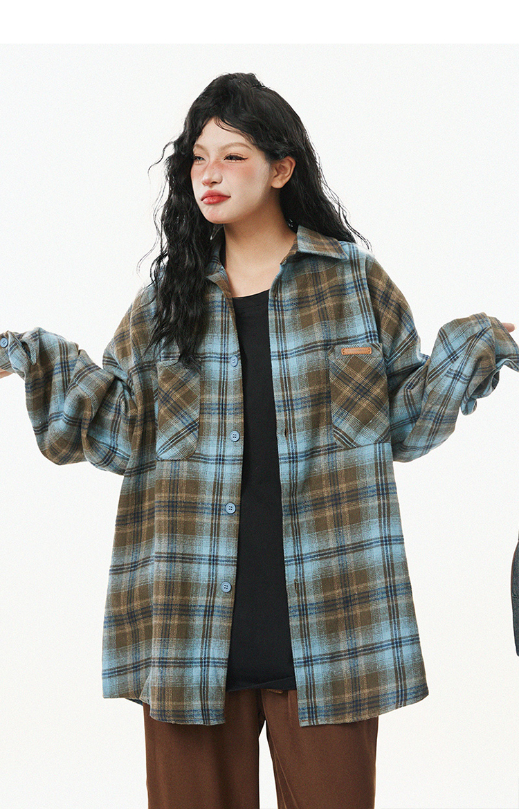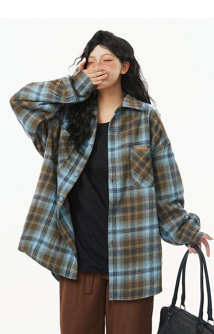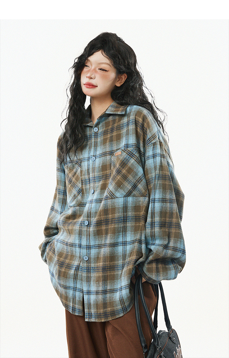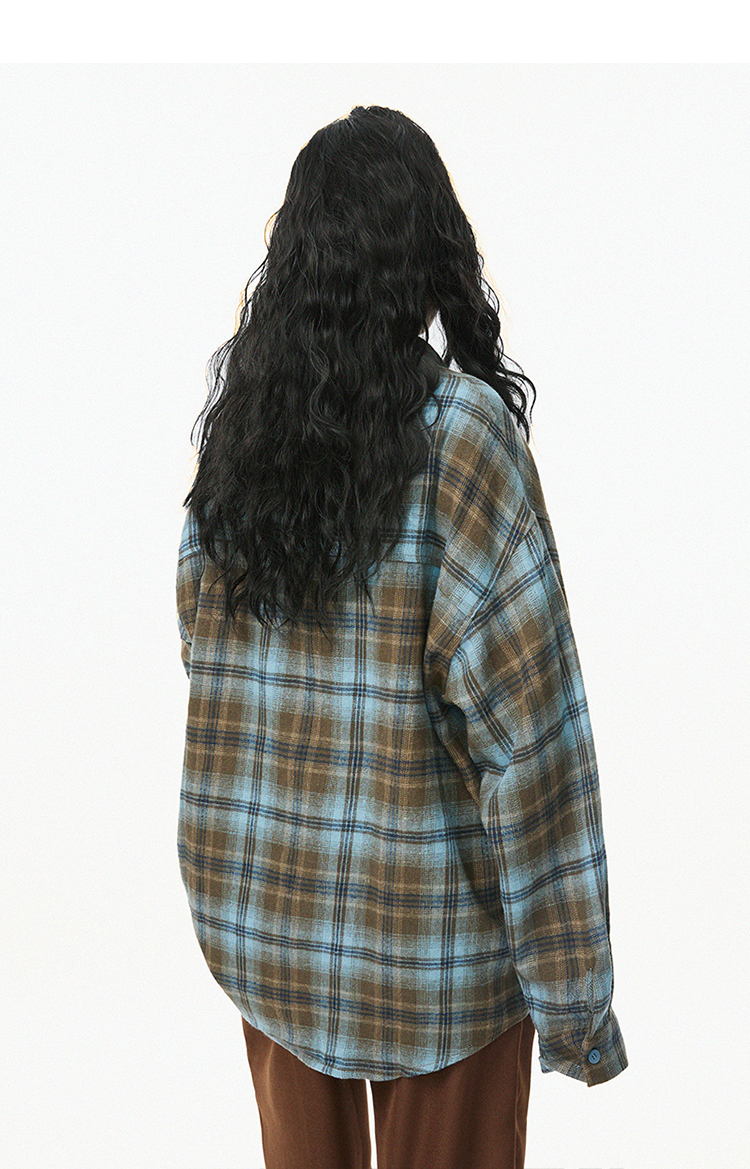 蓝可乐渐变格子衬衫女长袖2024秋季新款美式复古百搭宽松衬衣外套