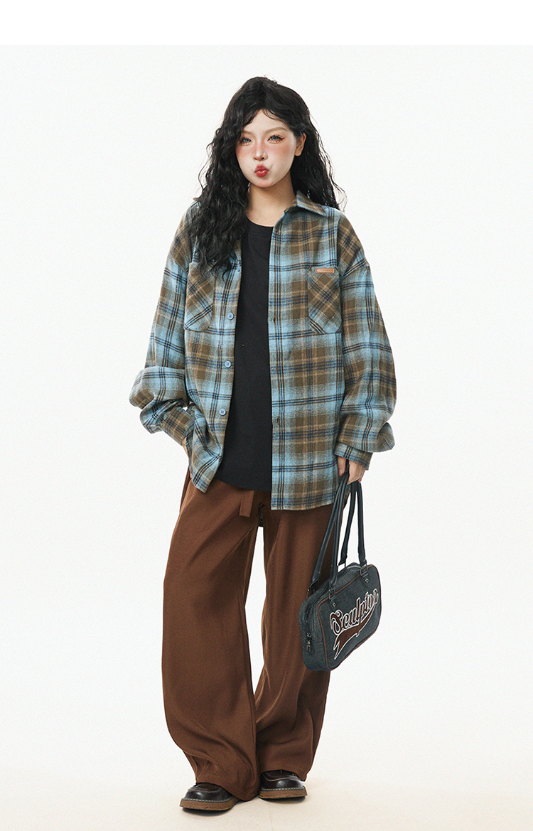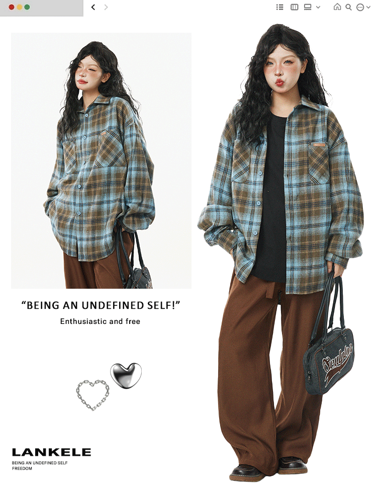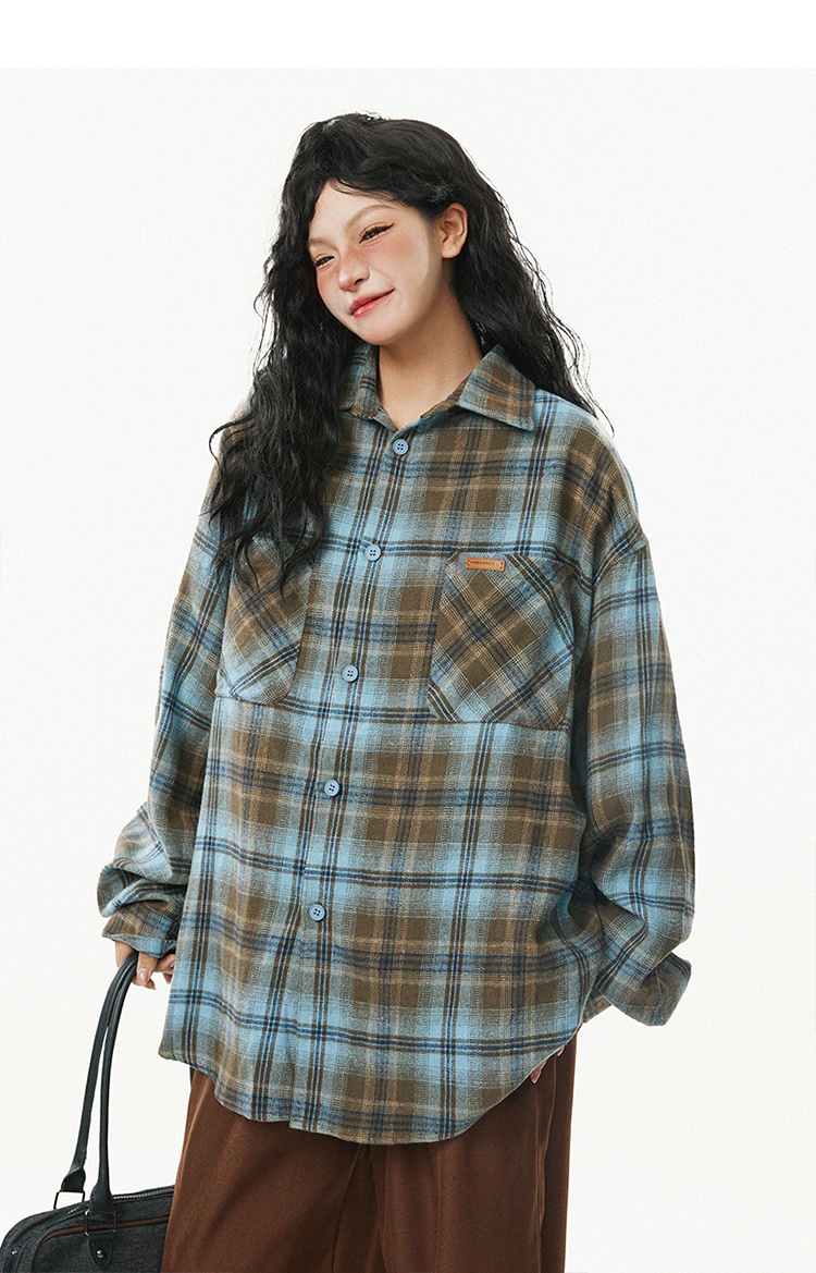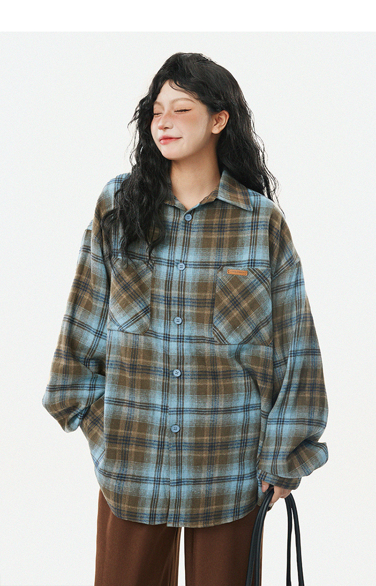 蓝可乐渐变格子衬衫女长袖2024秋季新款美式复古百搭宽松衬衣外套