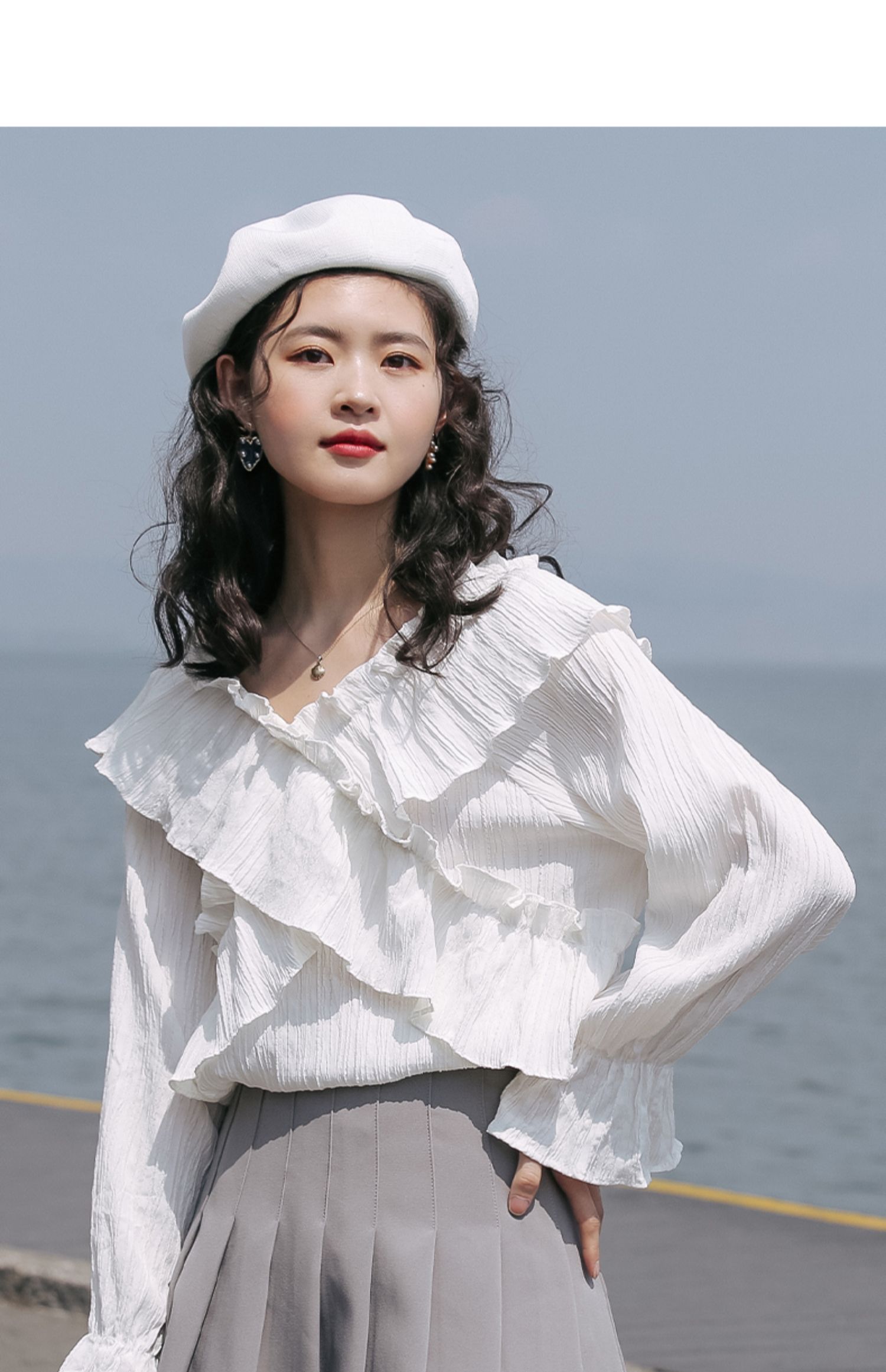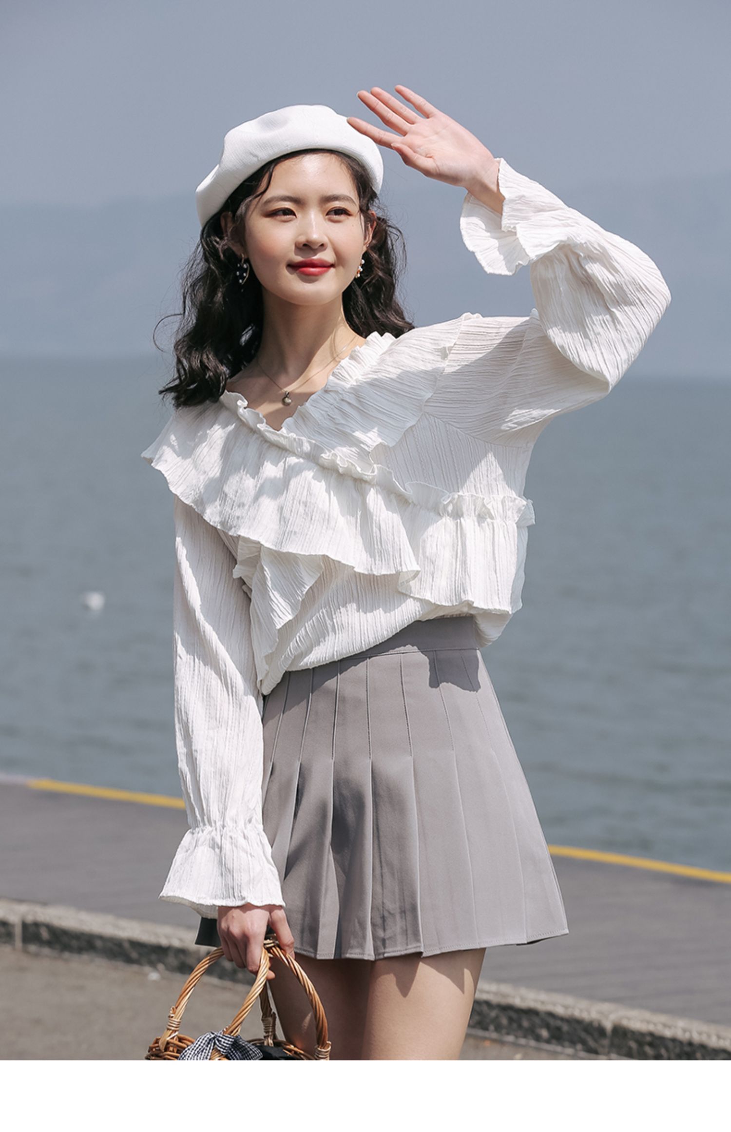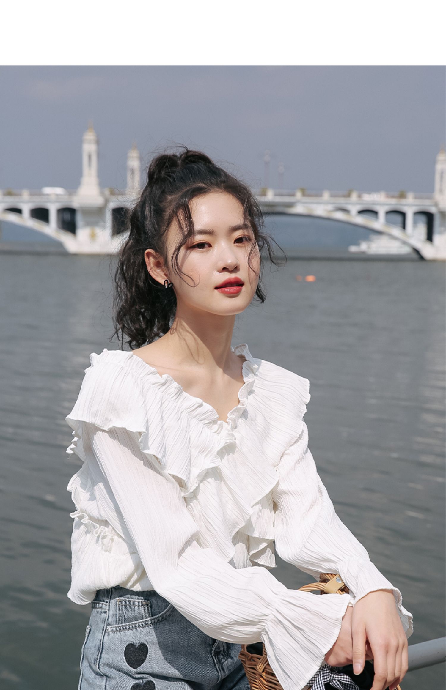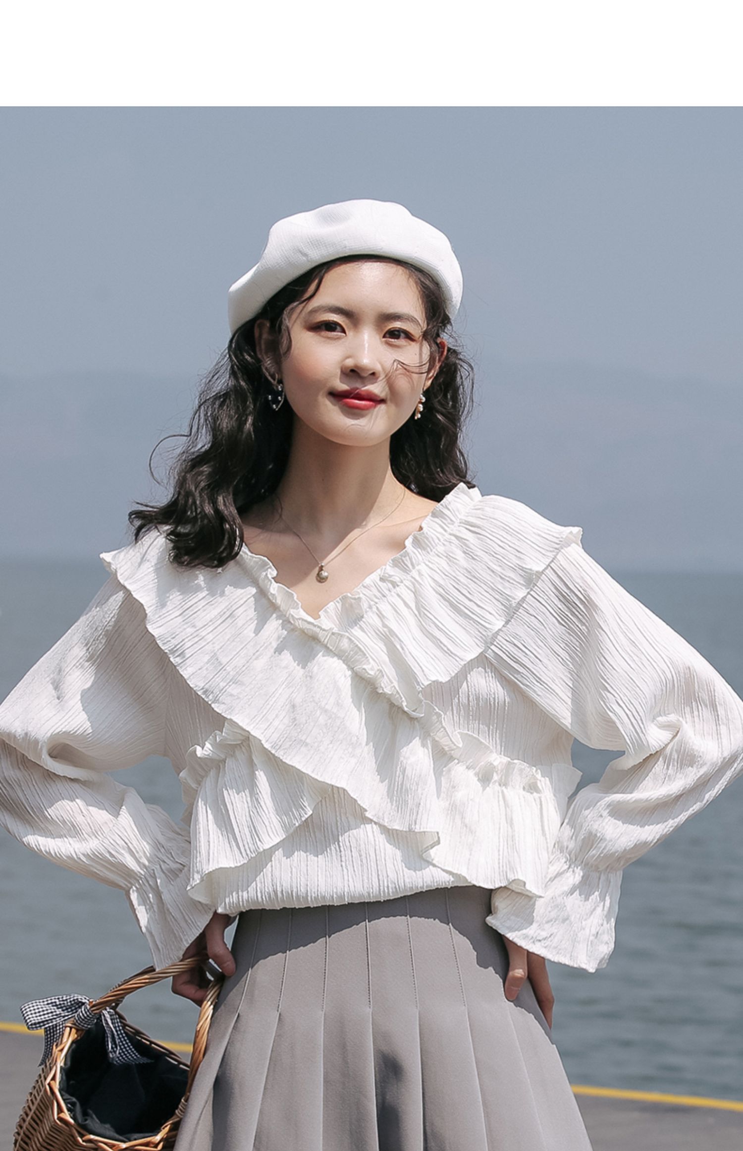 chic荷叶边甜系雪纺白衬衫女2024秋季新款V领设计感小众别致上衣