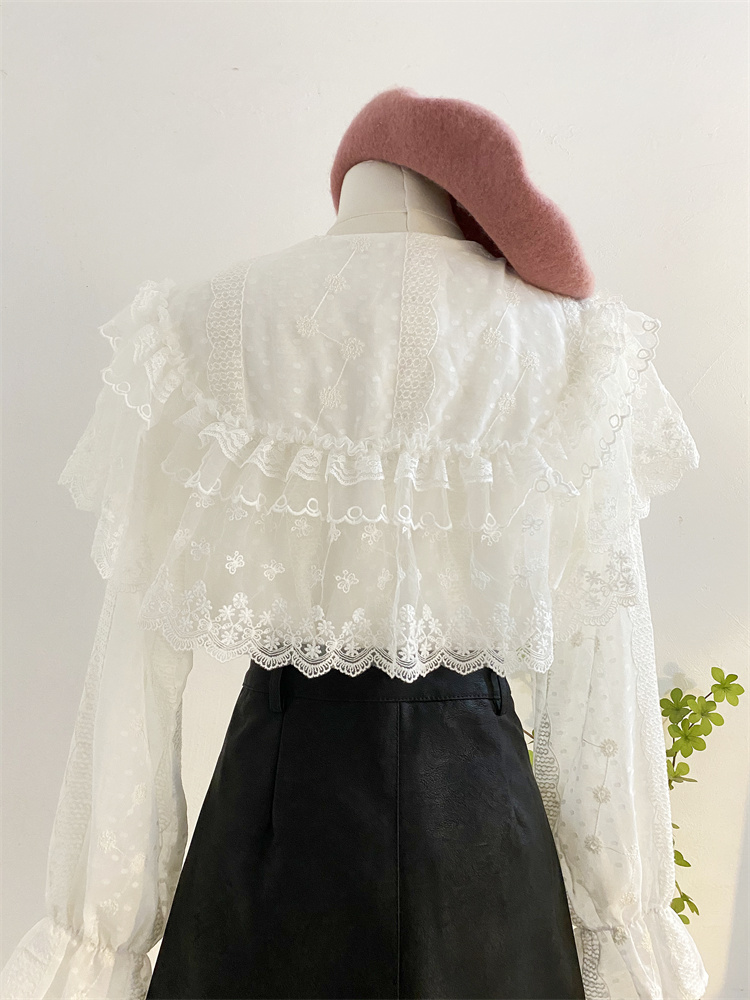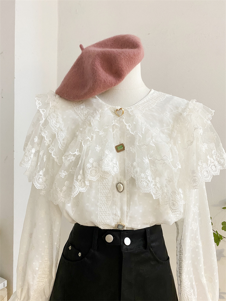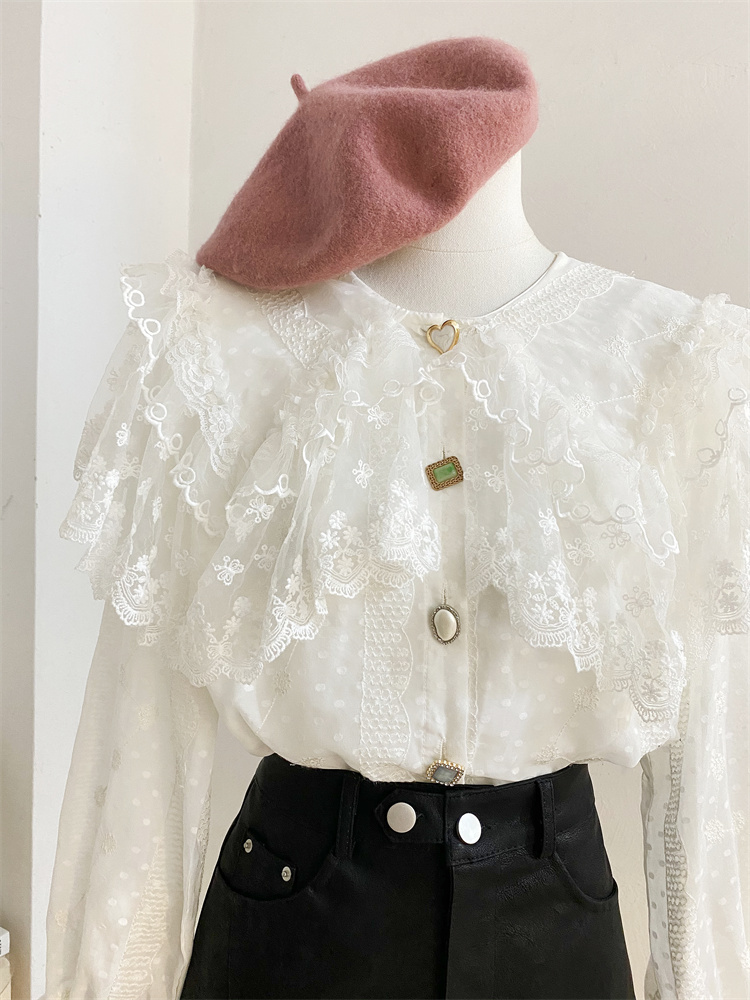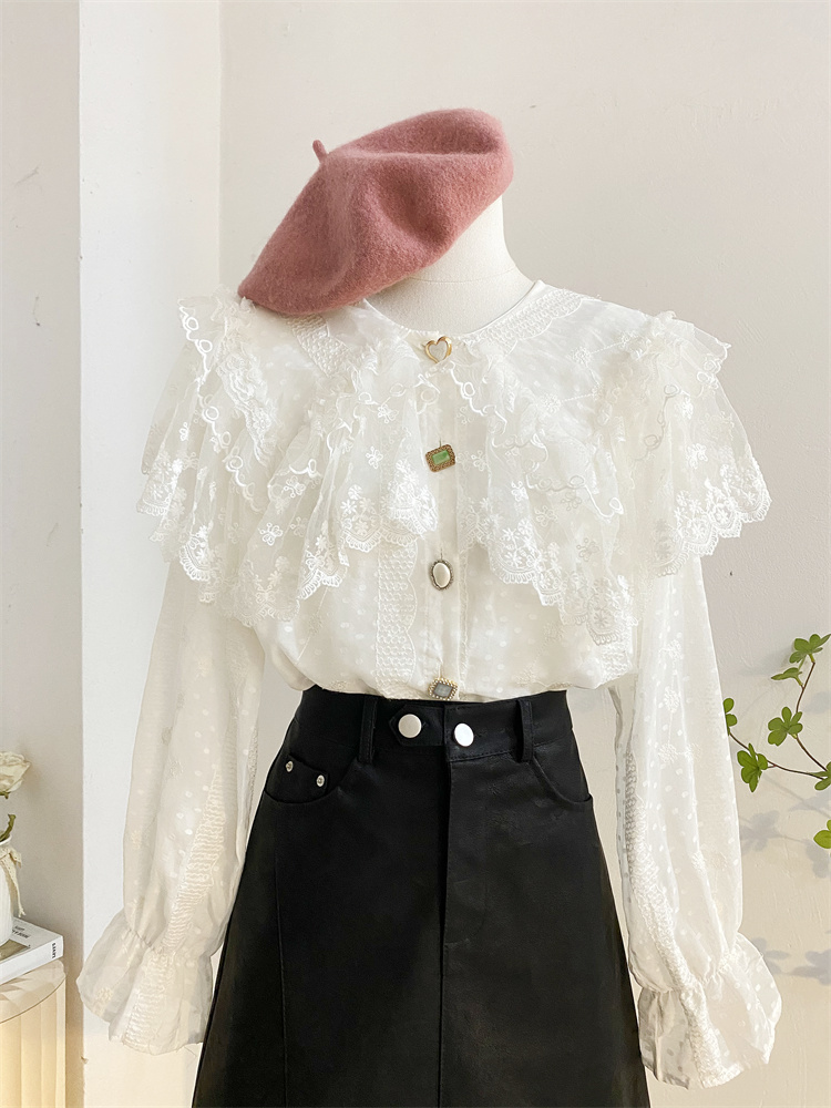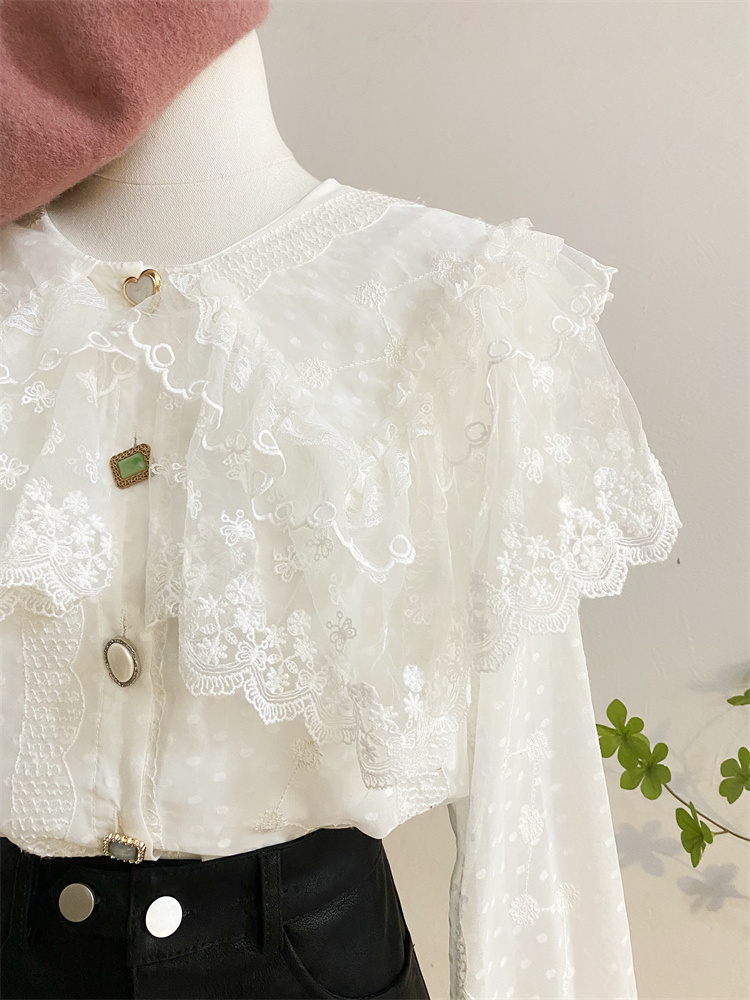 重工蕾丝花边娃娃领衬衫女秋冬设计感小众宽松甜美刺绣雪纺衫上衣