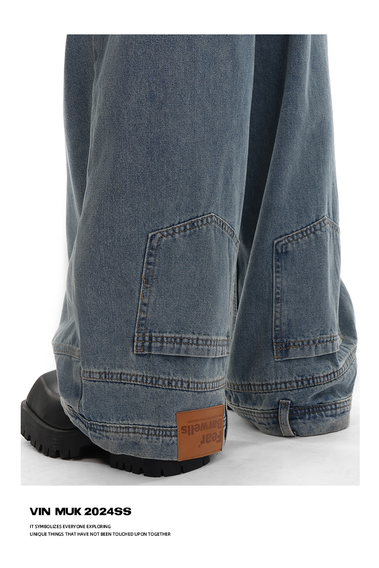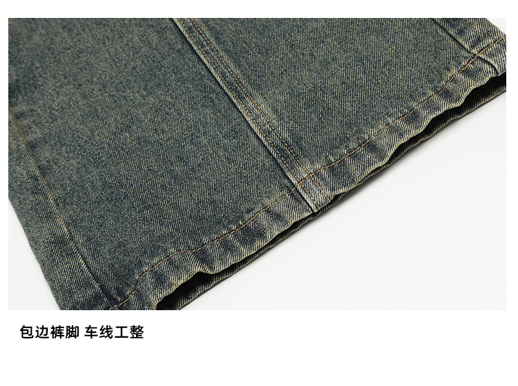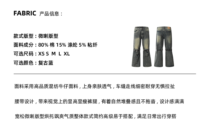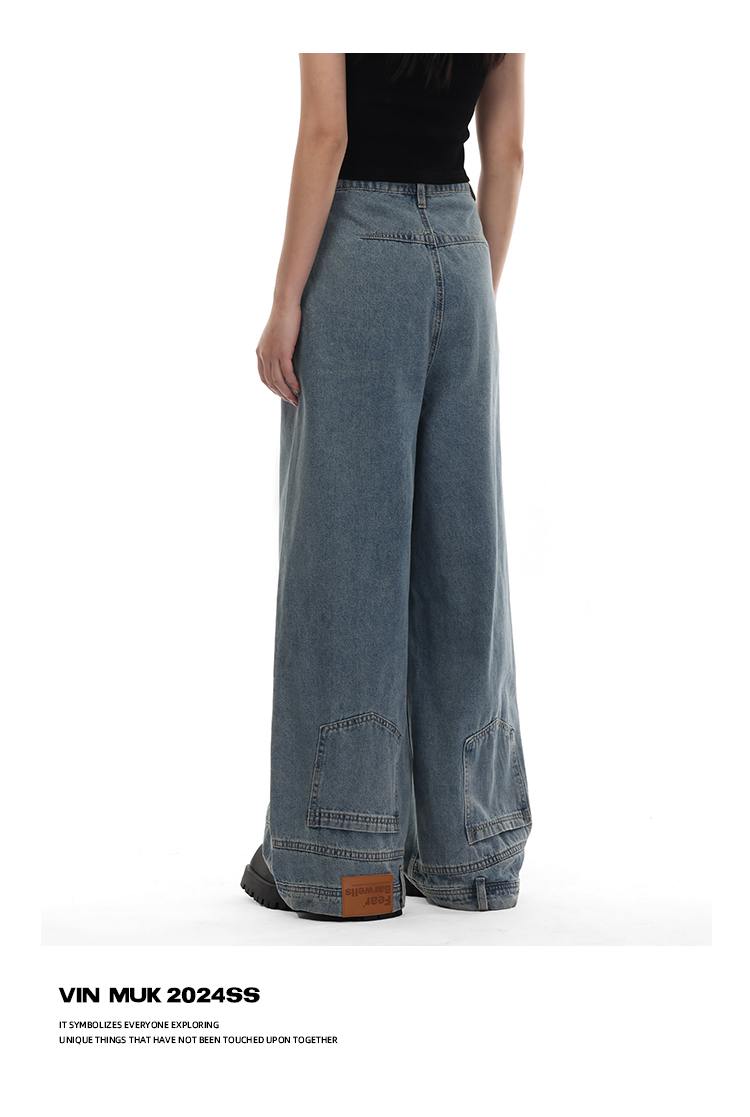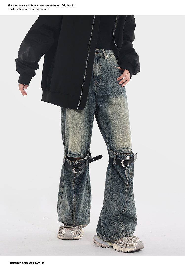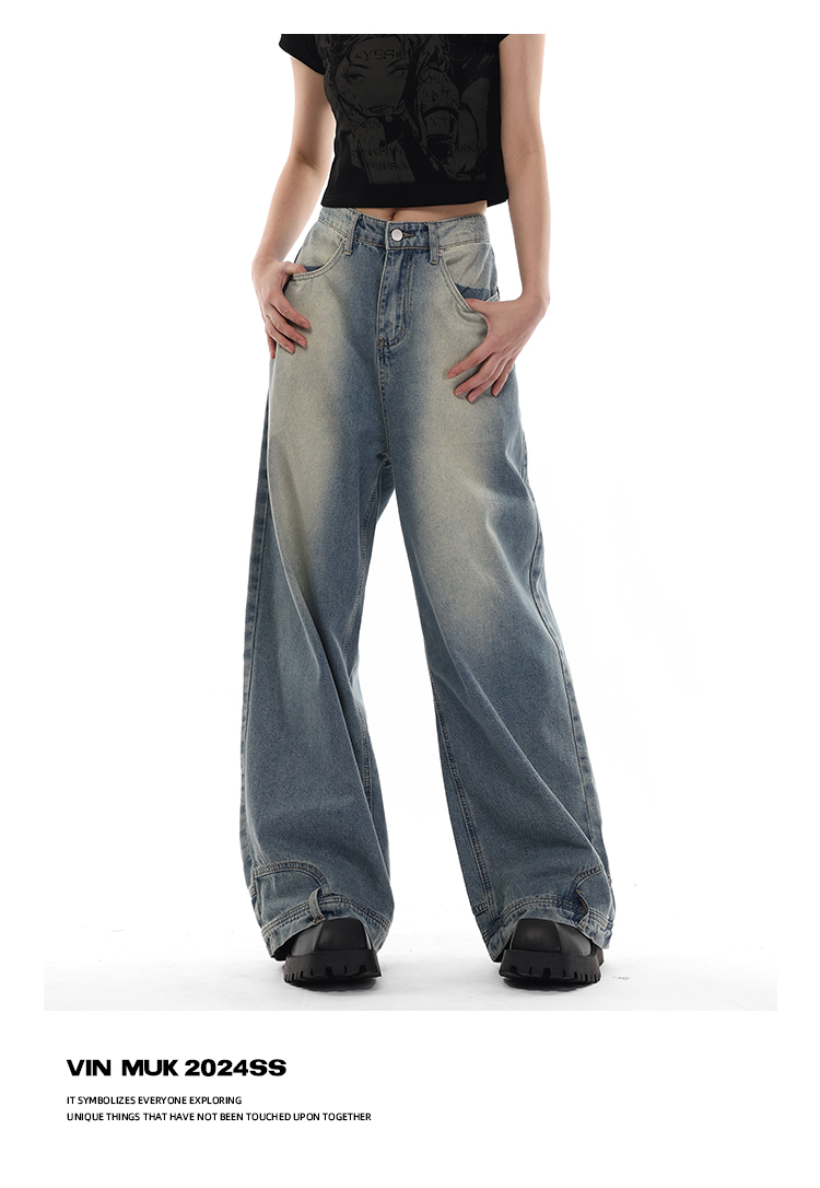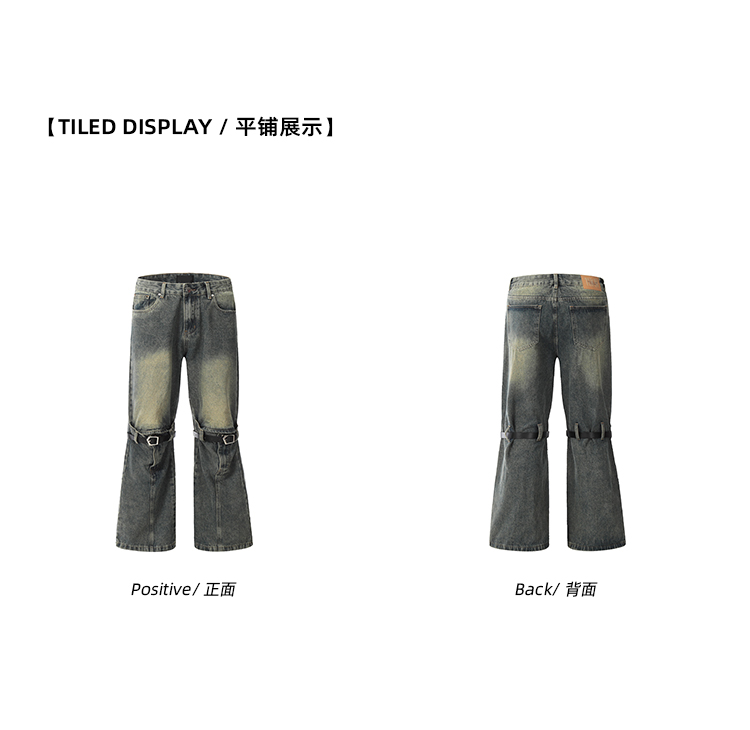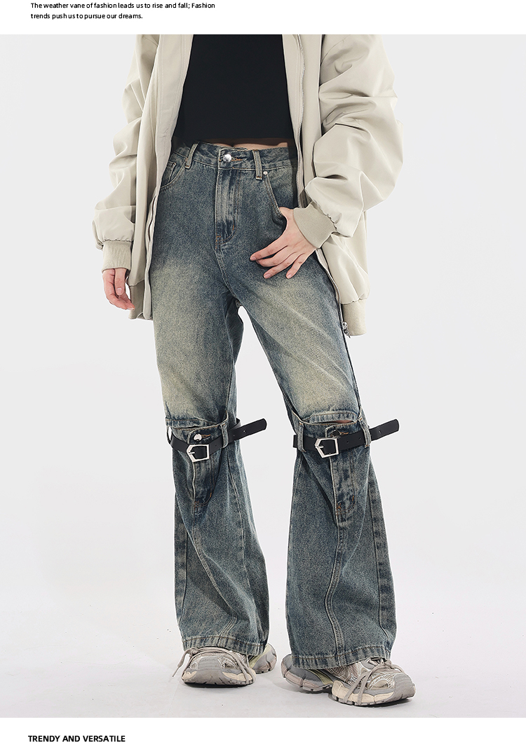 VIN MUK 美式复古水洗做旧微喇牛仔裤高腰皮带拼接设计感长裤子女