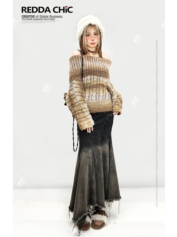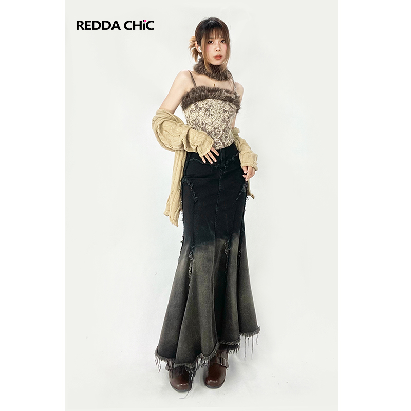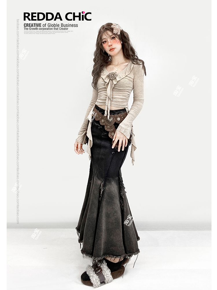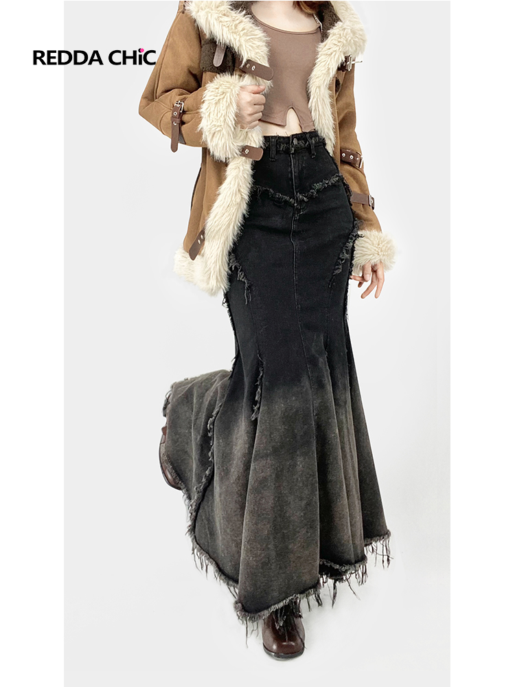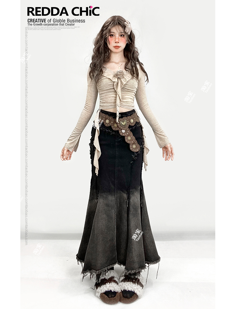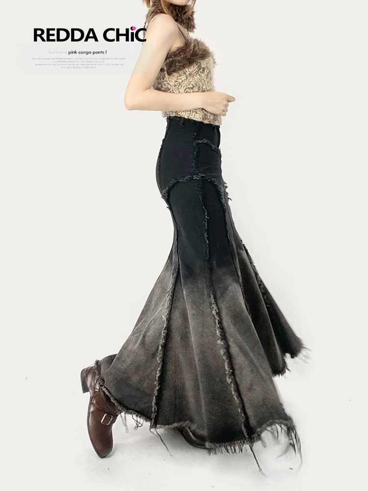 美拉德复古法式牛仔鱼尾裙女秋修身不规则荷叶边渐变黑色半身长裙