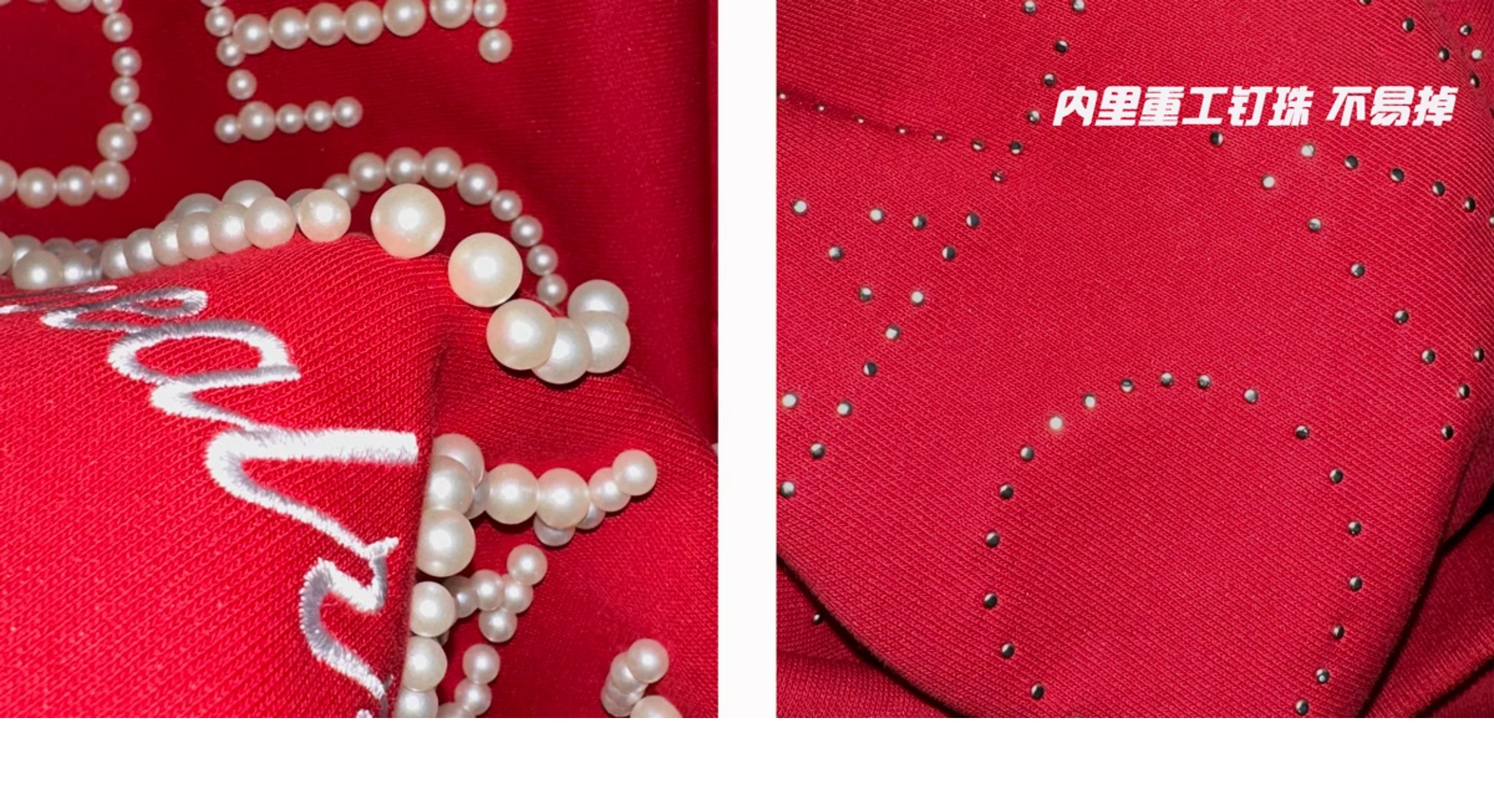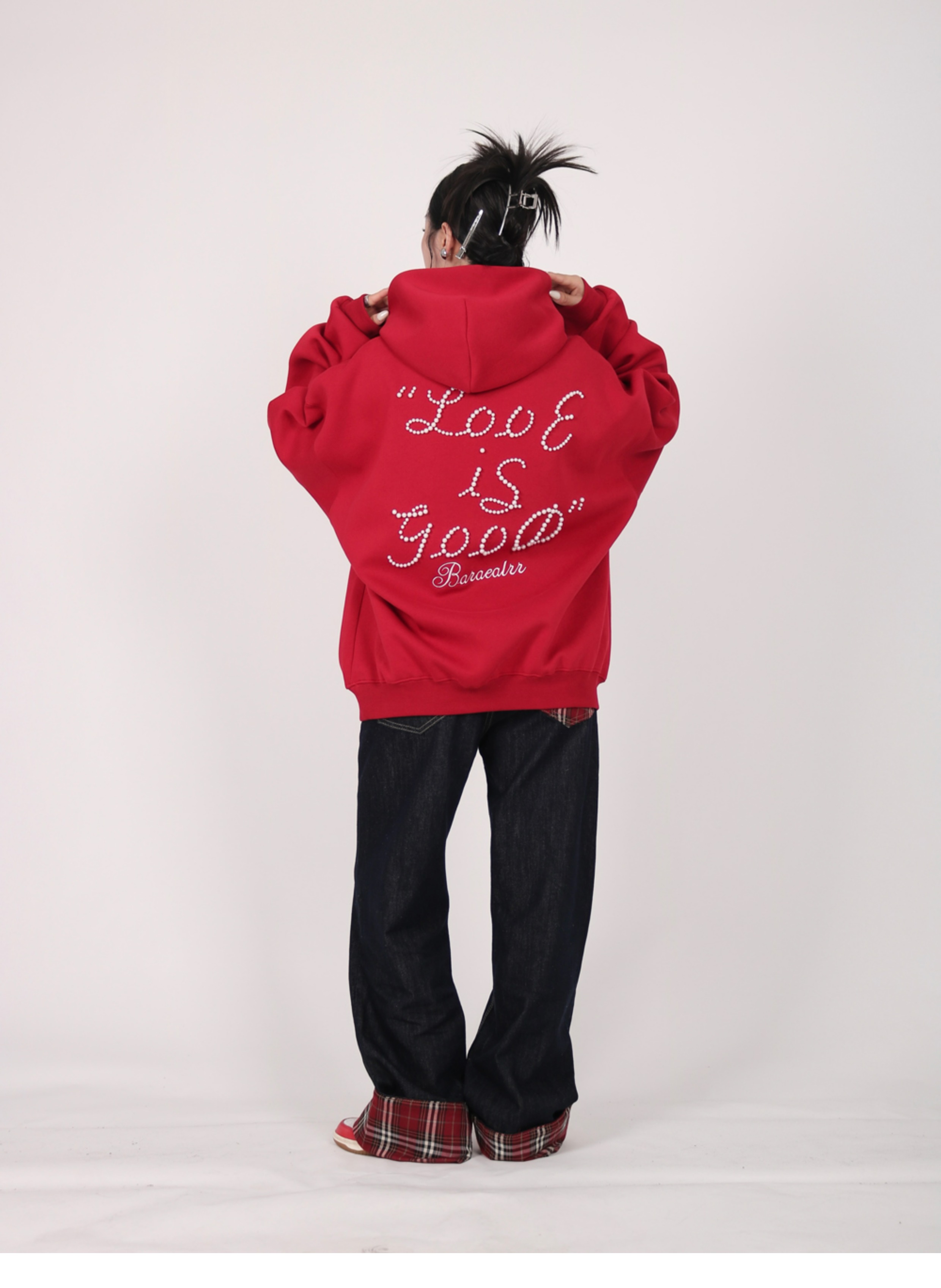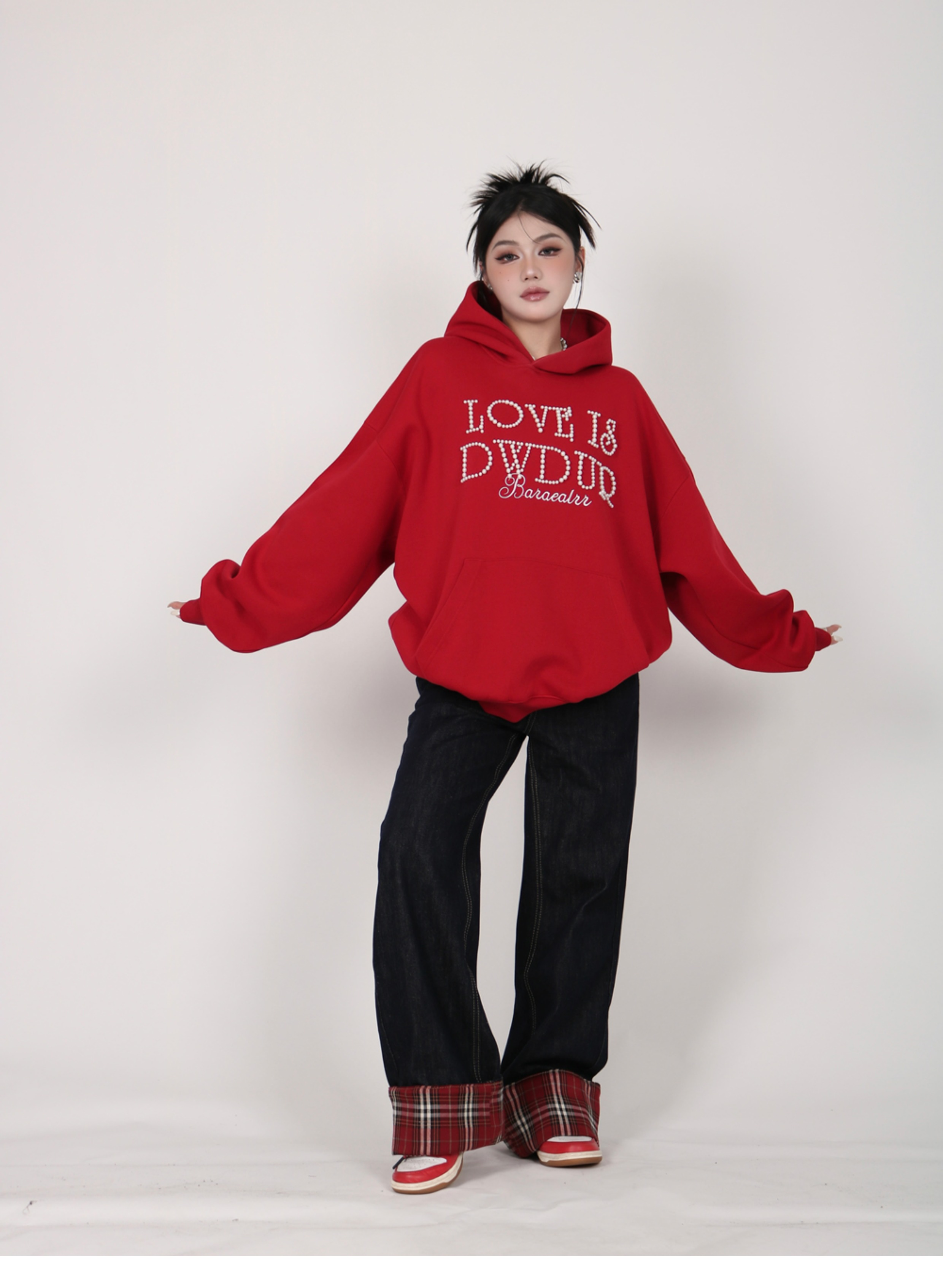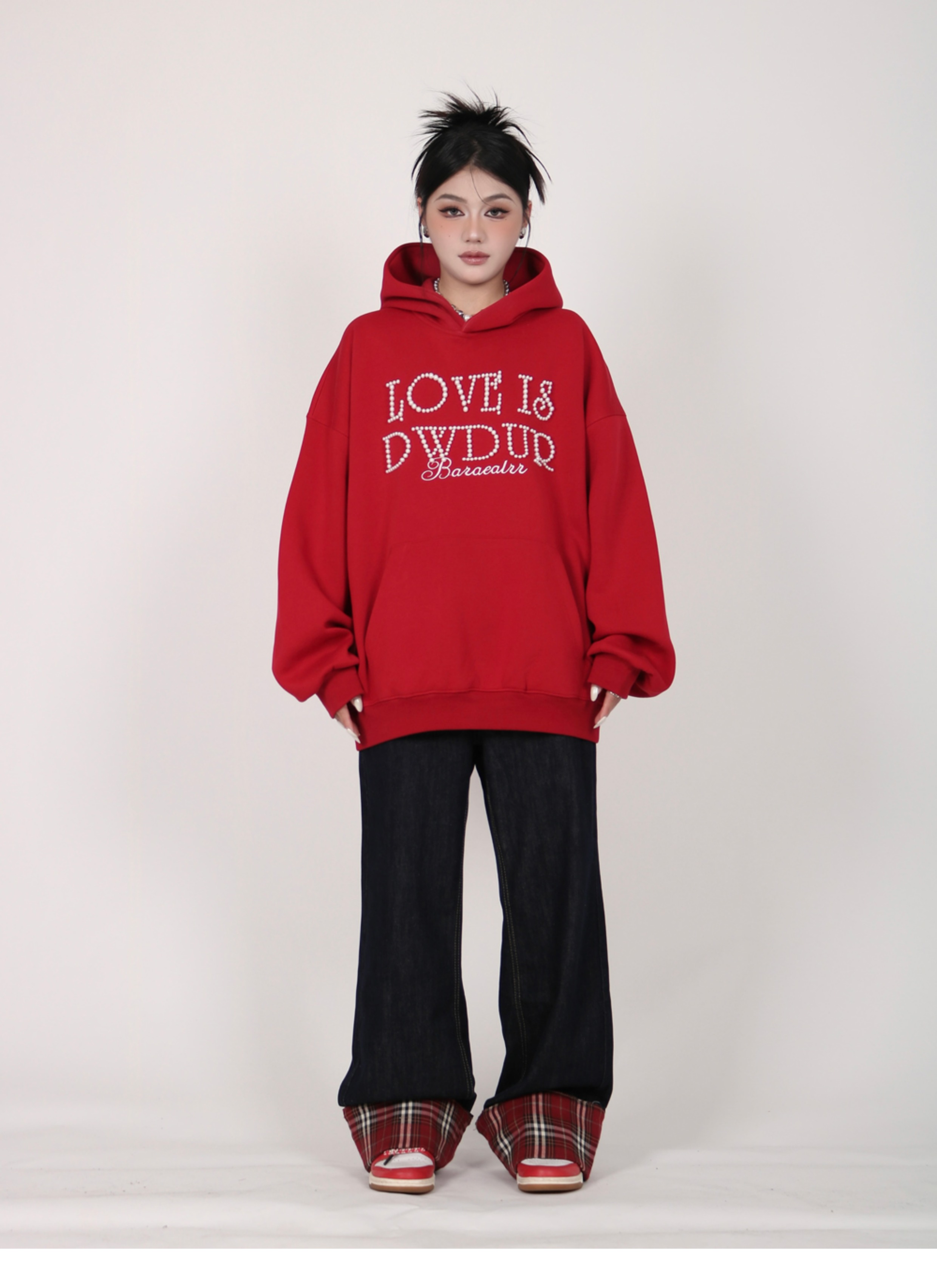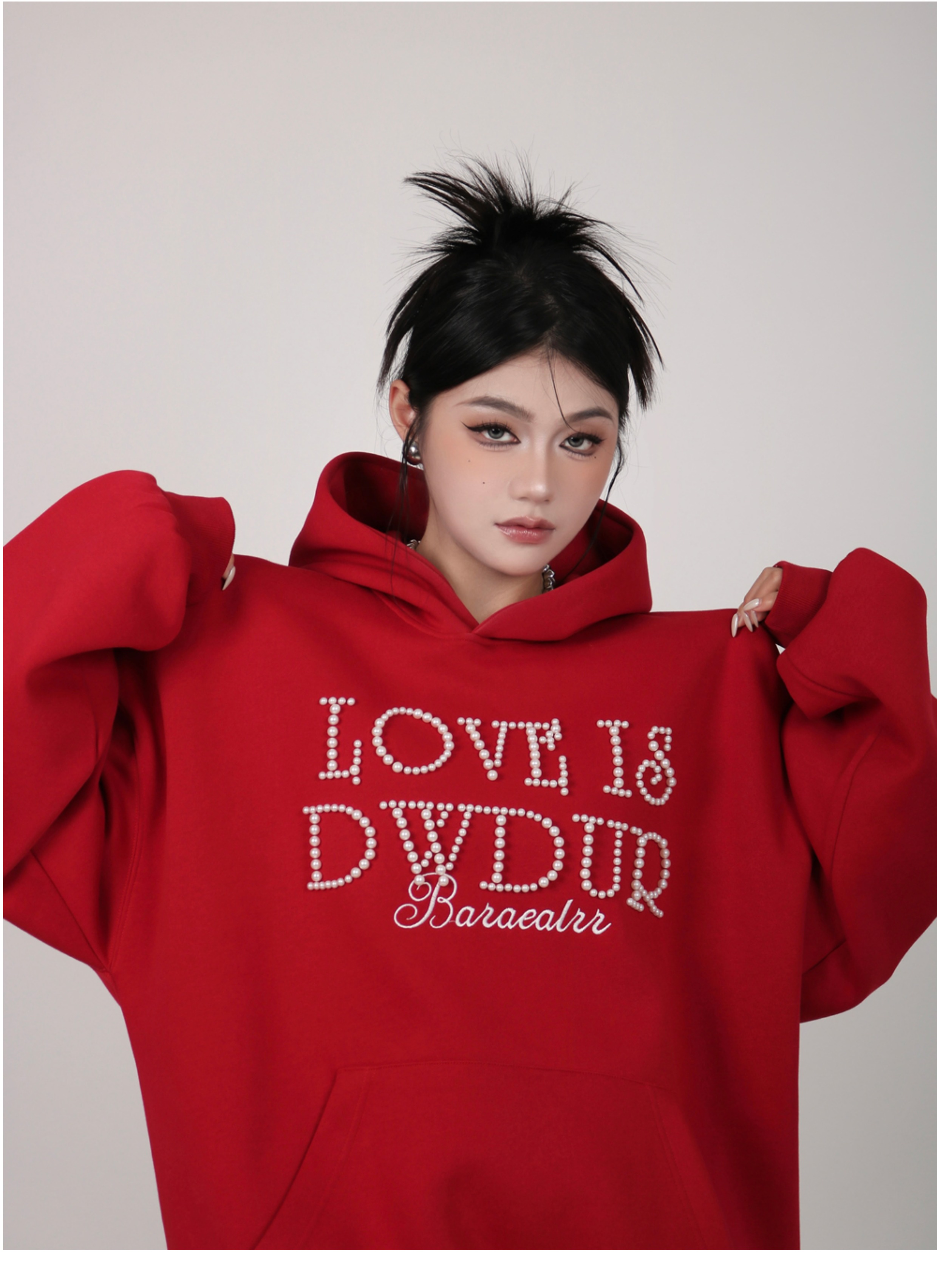 INGA美式复古小众设计感珍珠字母红色卫衣女秋冬小众上衣情侣外套