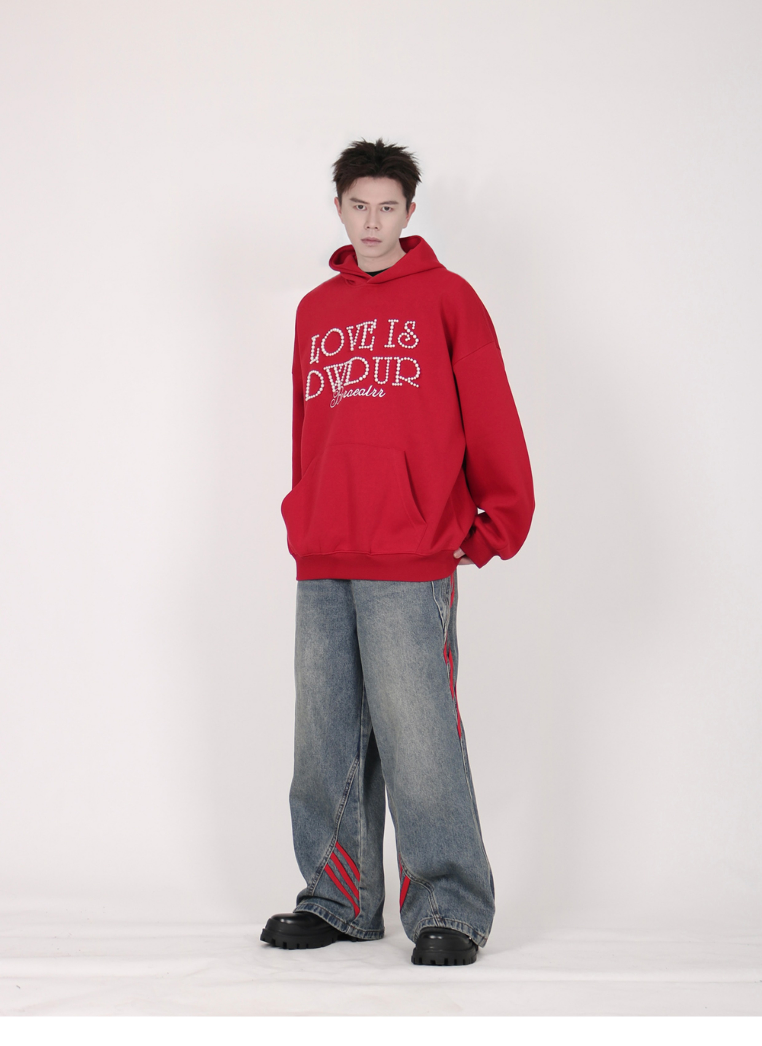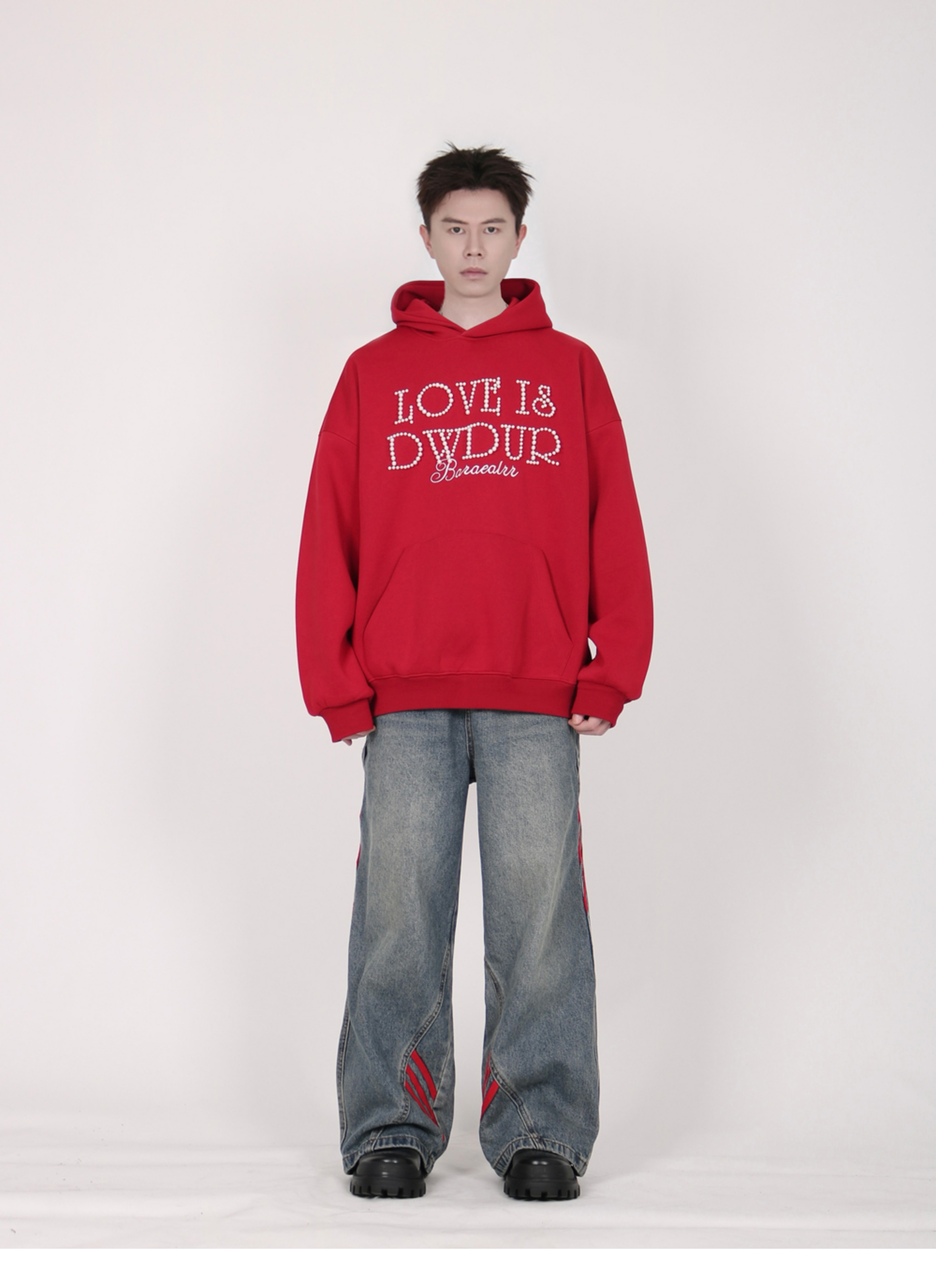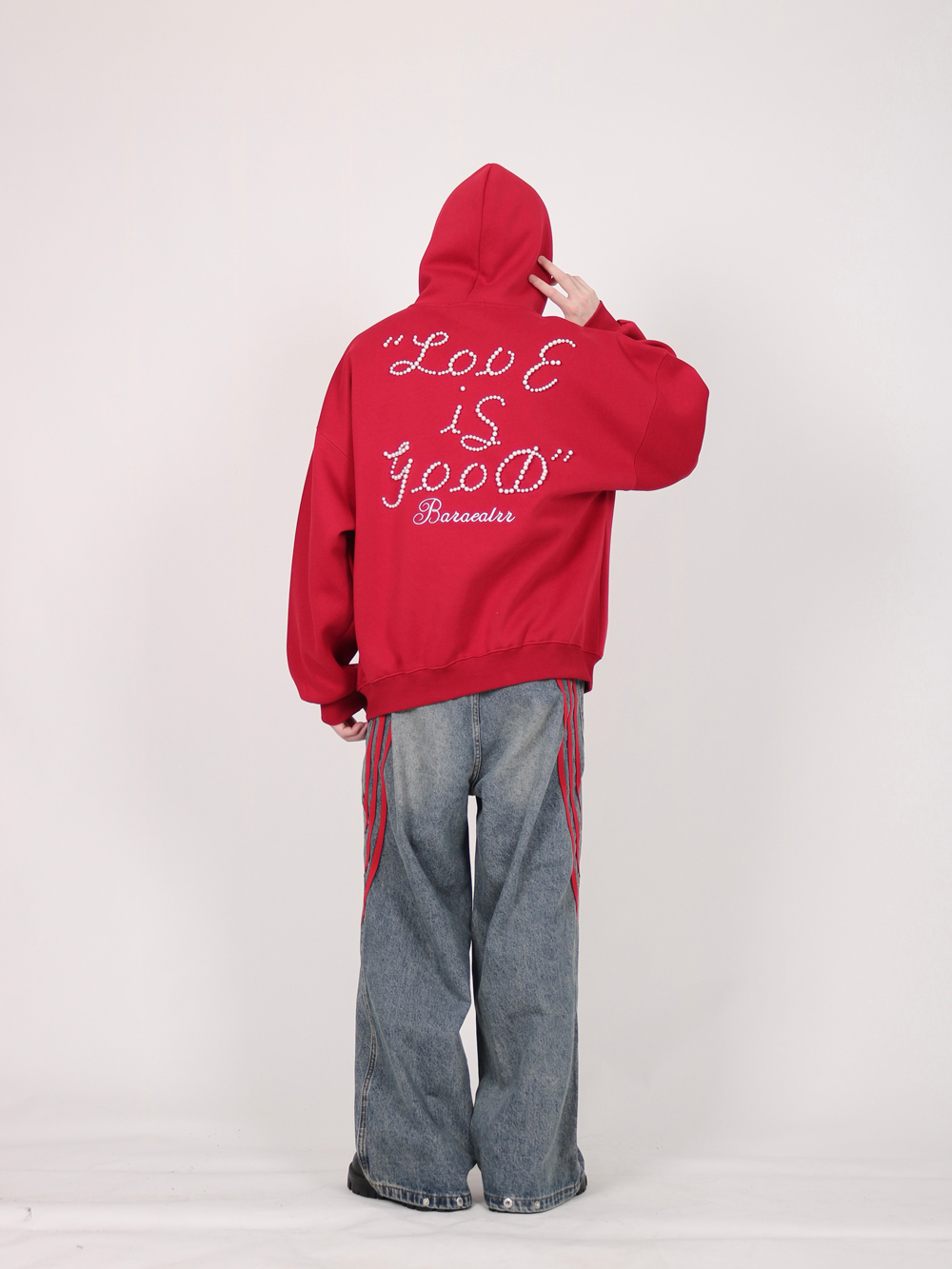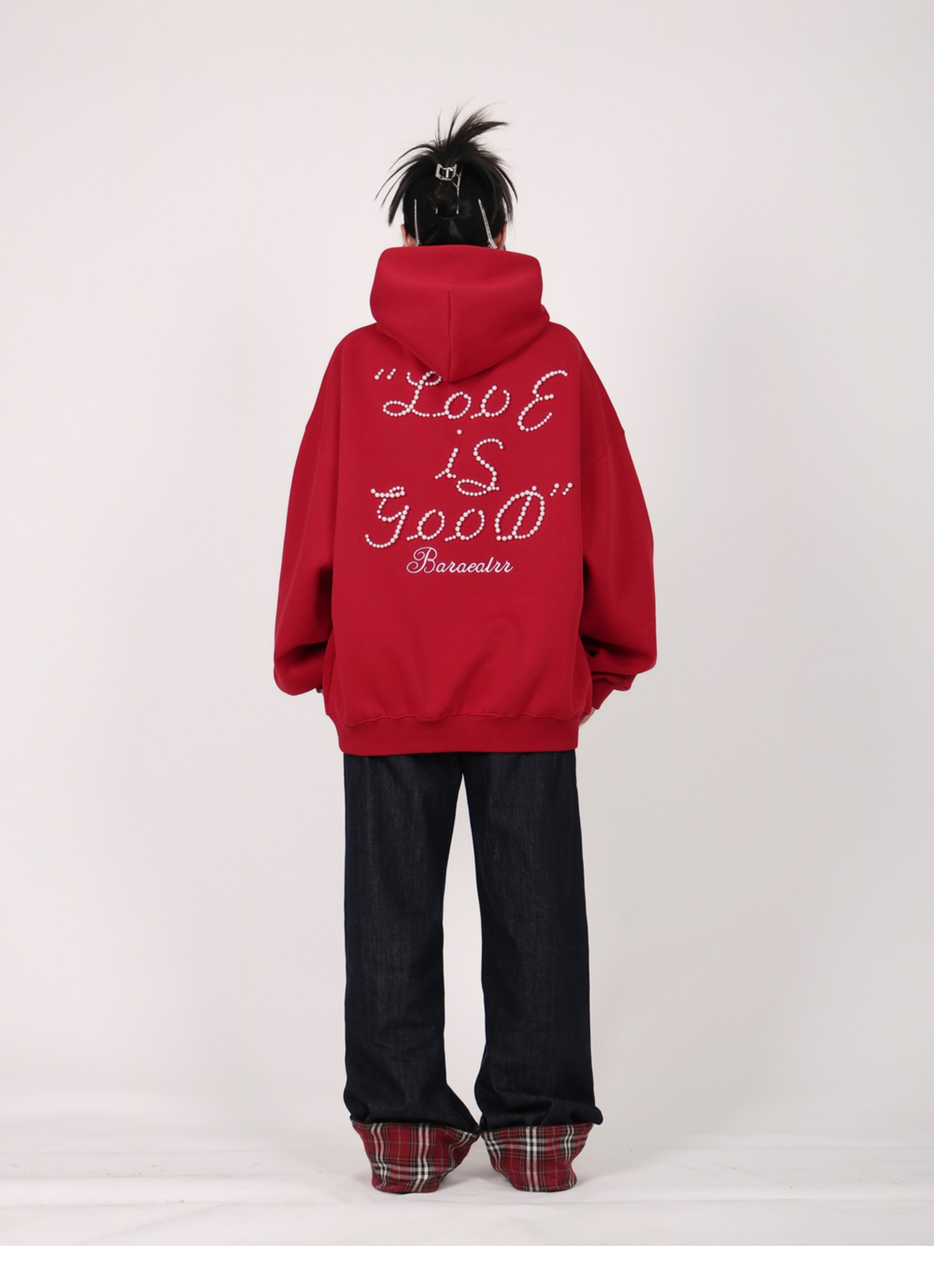 INGA美式复古小众设计感珍珠字母红色卫衣女秋冬小众上衣情侣外套