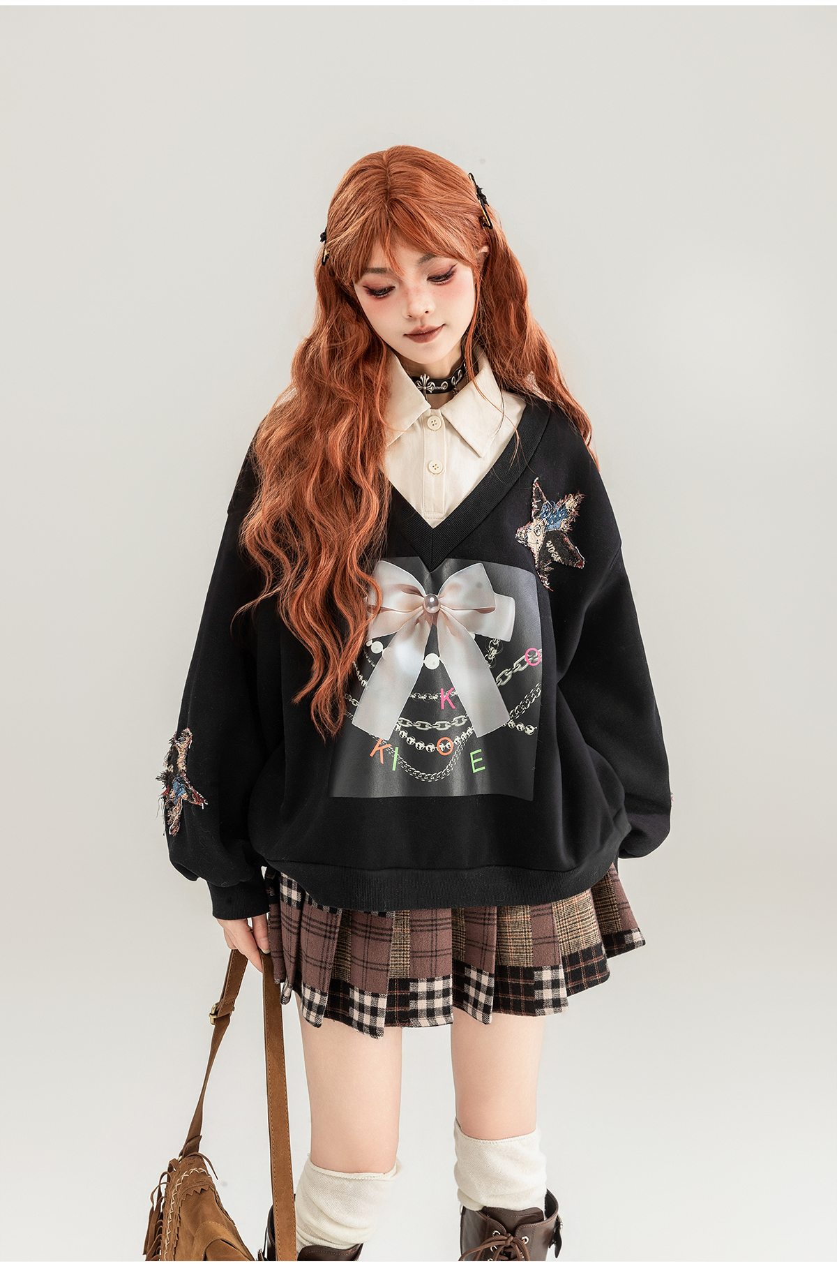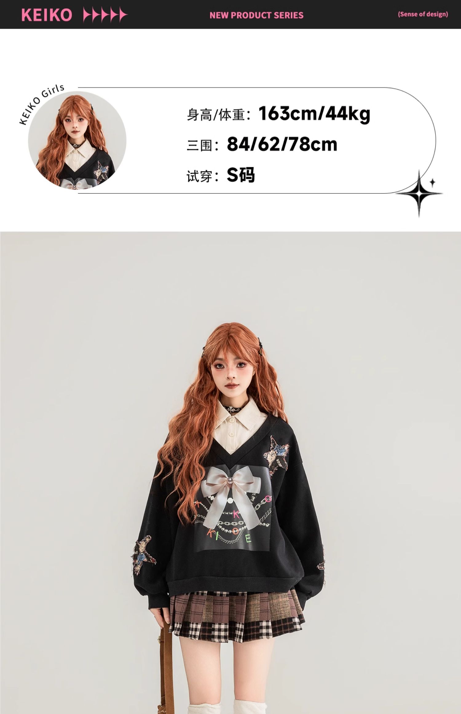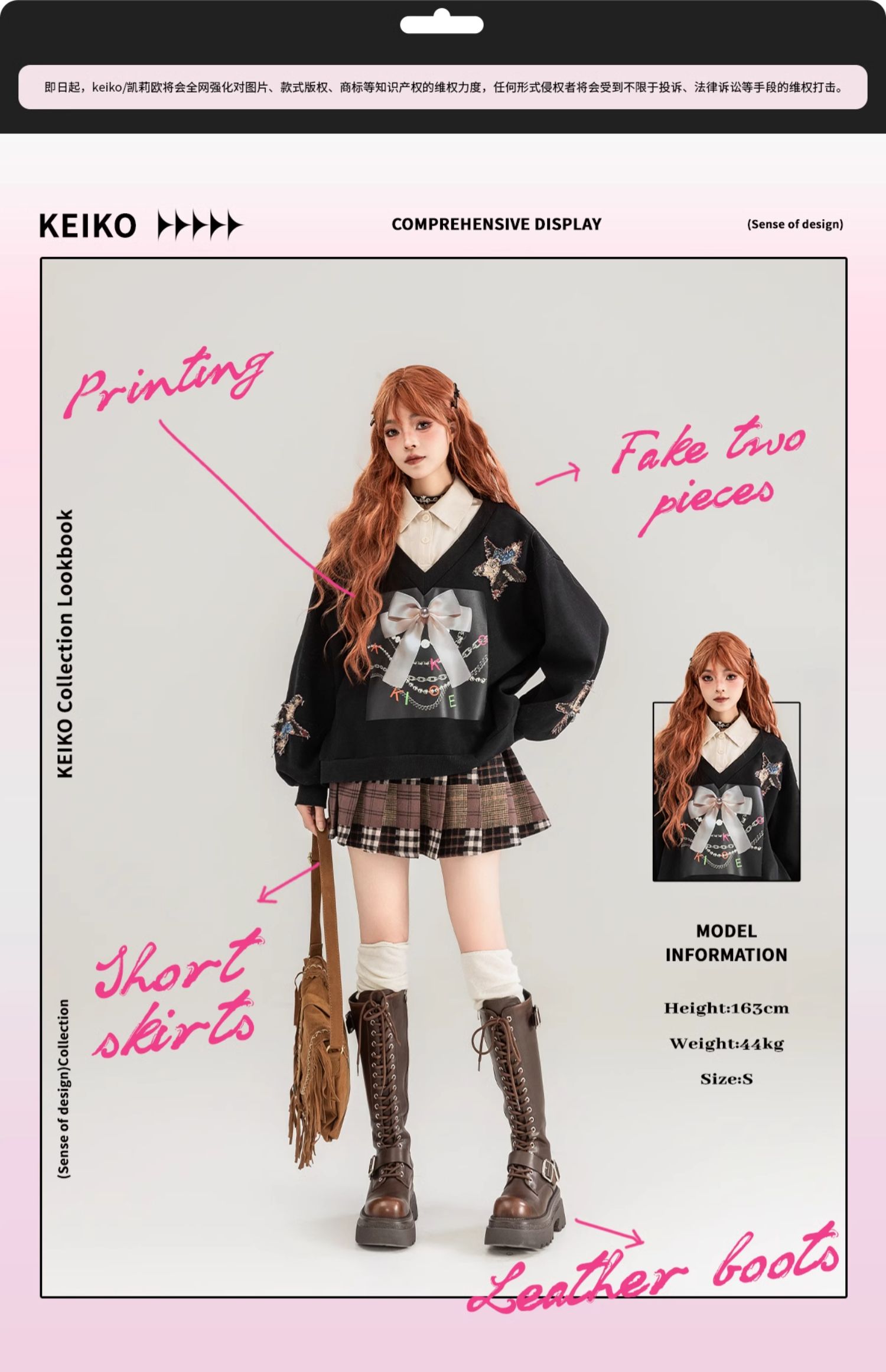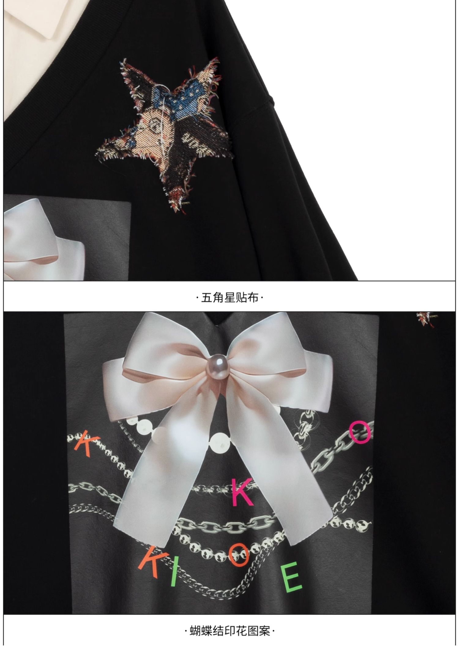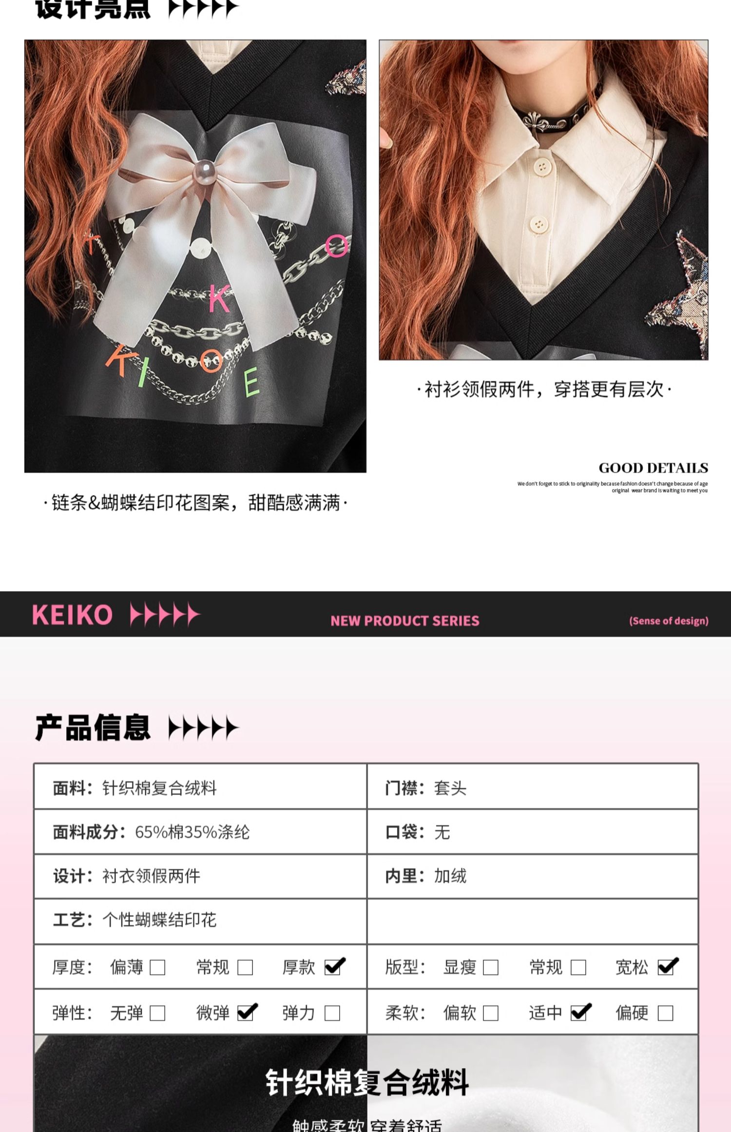 KEIKO [加密绒] 蝴蝶结印花假两件卫衣2024早秋设计感polo领外套