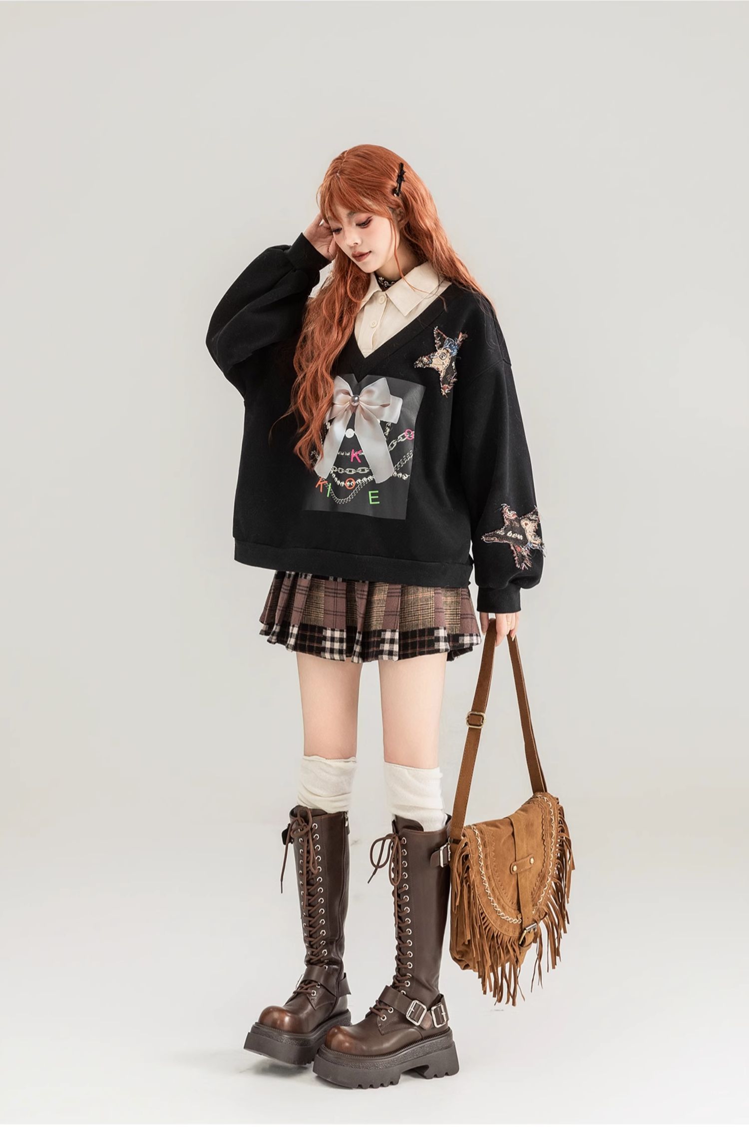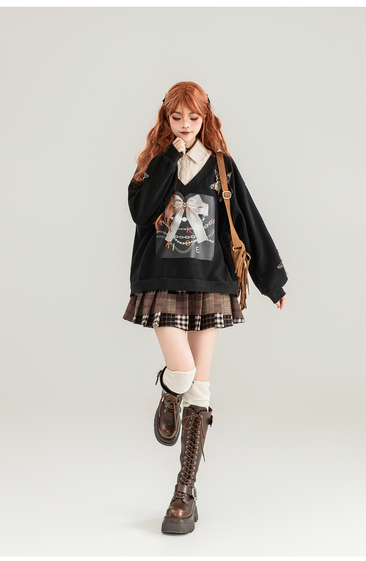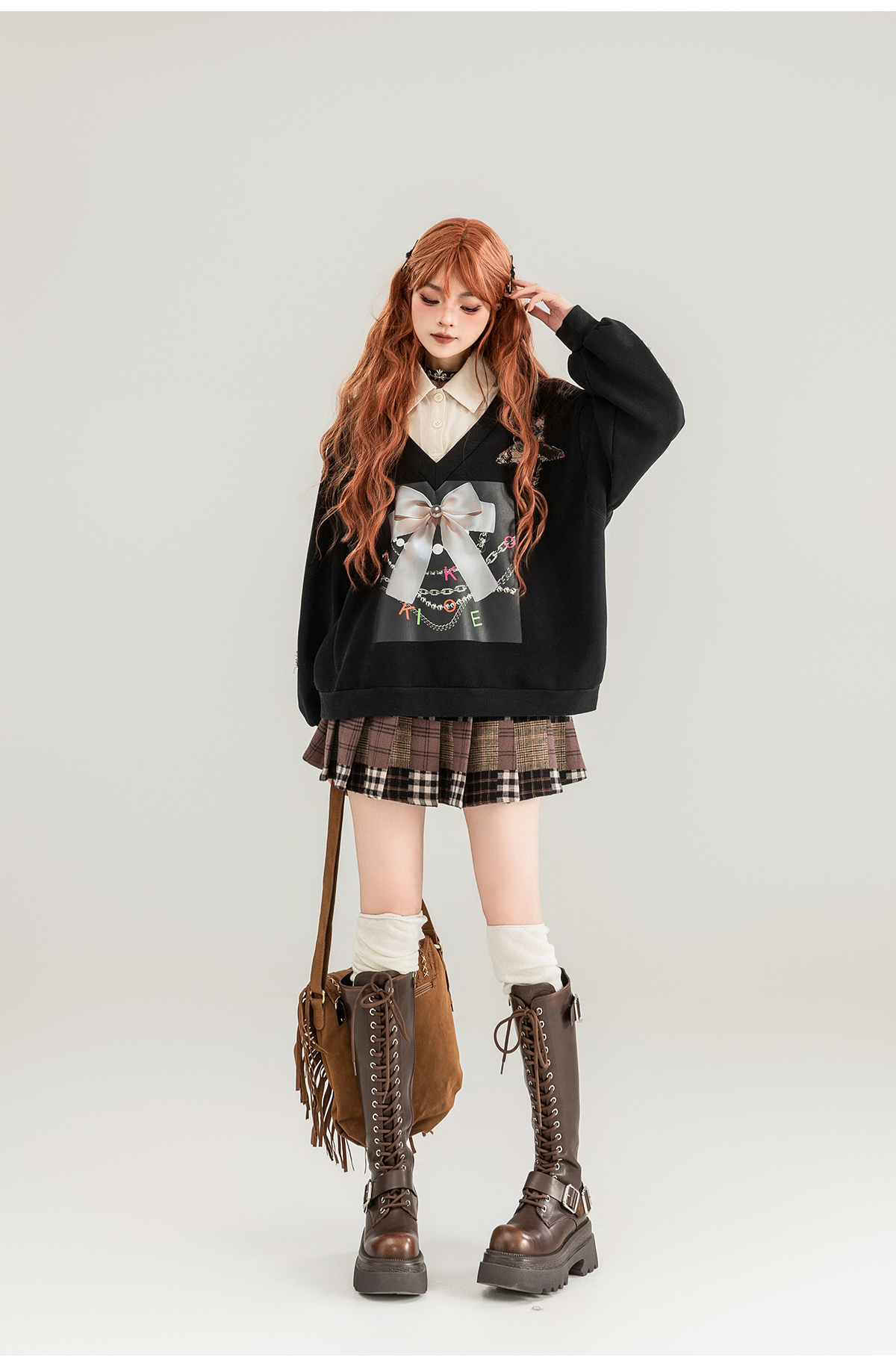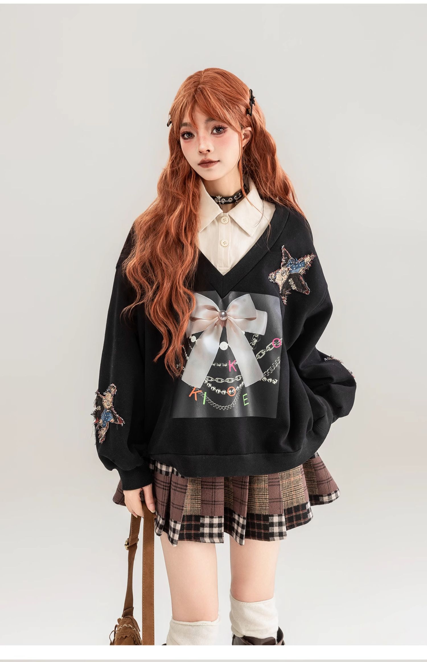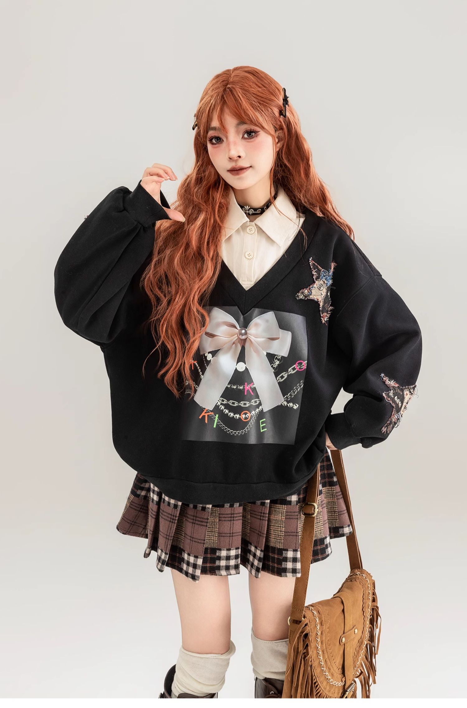 KEIKO [加密绒] 蝴蝶结印花假两件卫衣2024早秋设计感polo领外套
