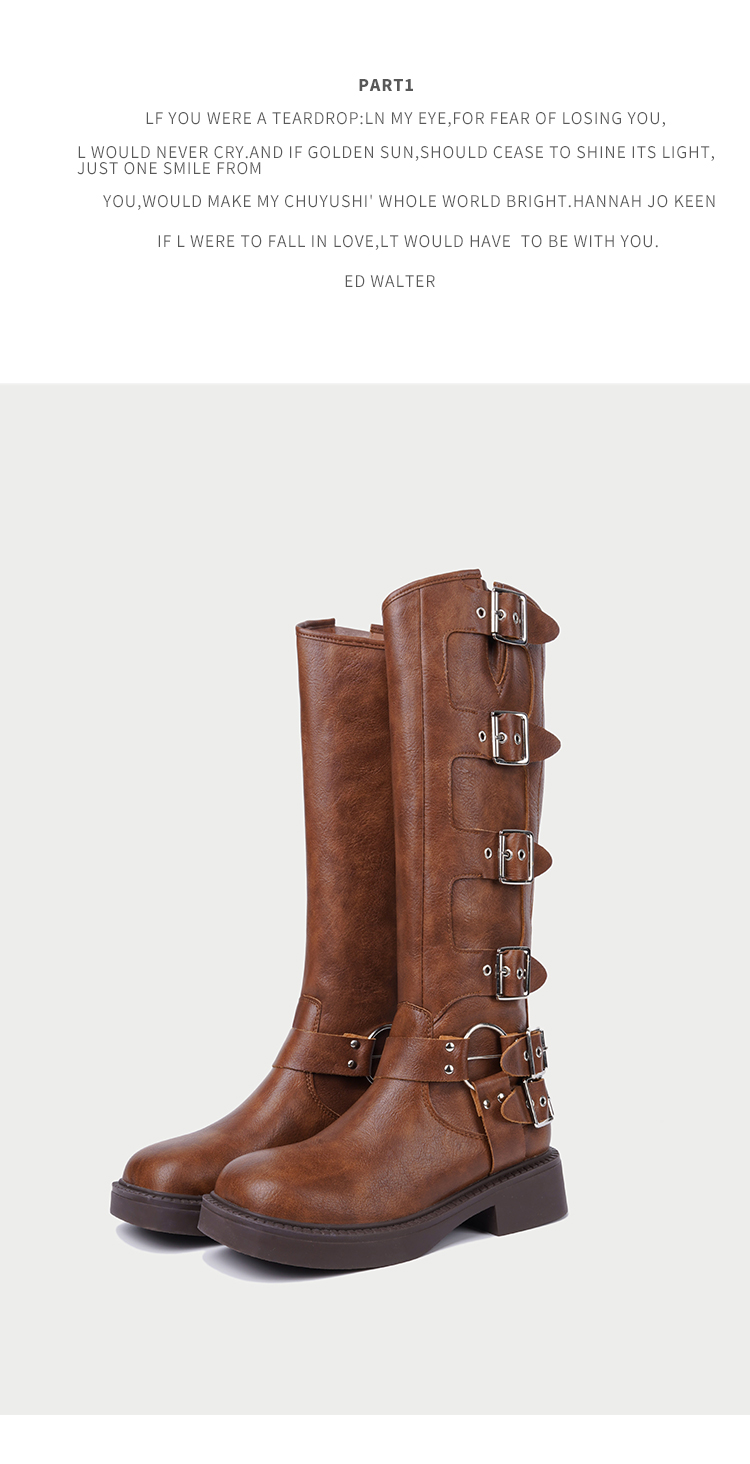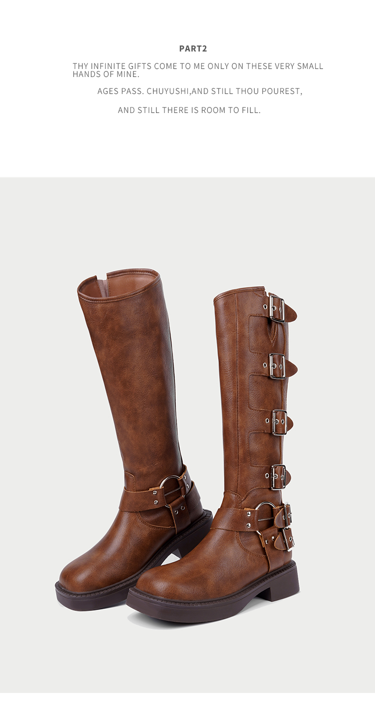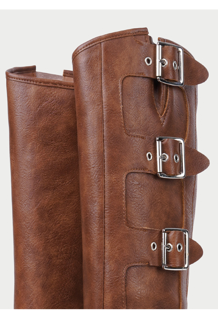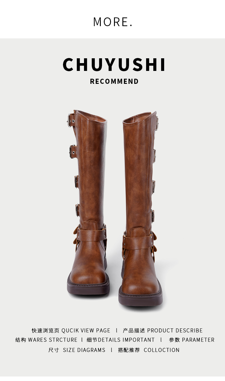 CHUYUSHI 棕色长筒靴女复古百搭扣搭套筒机车骑士靴西部牛仔靴子