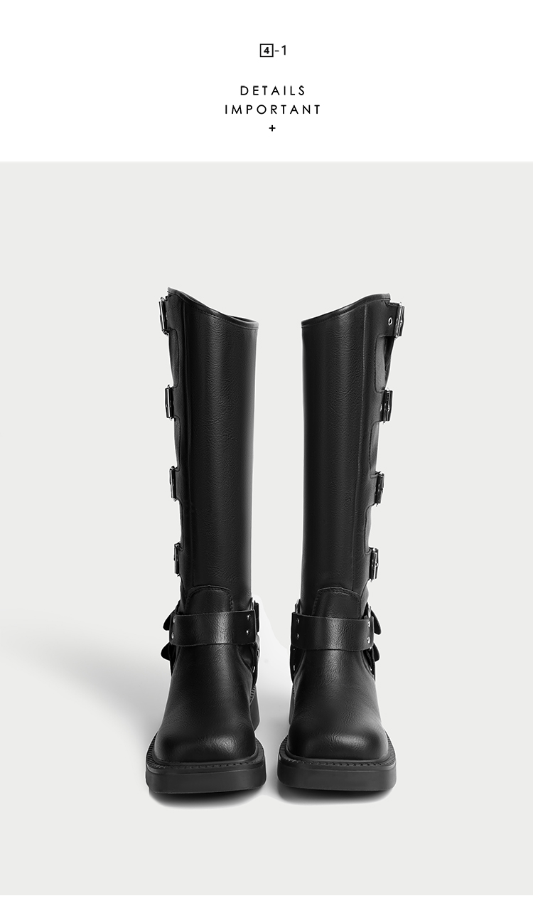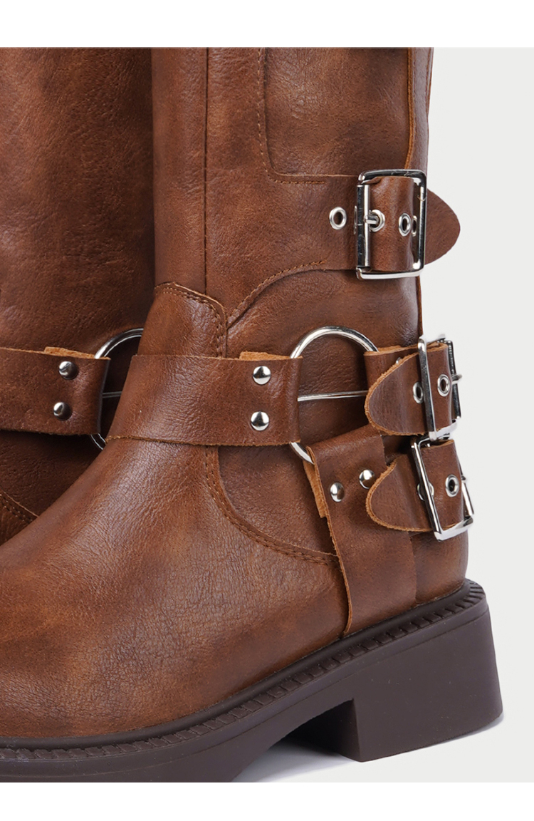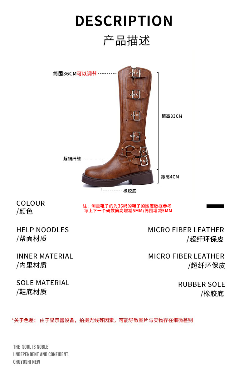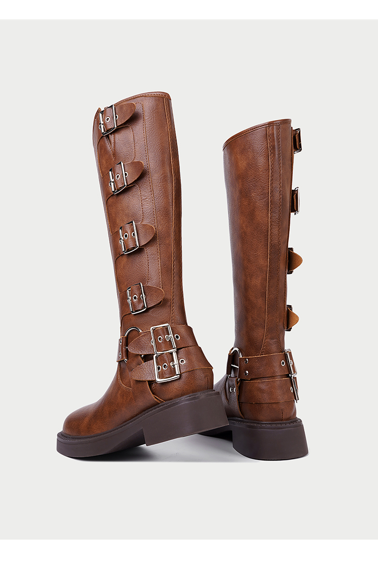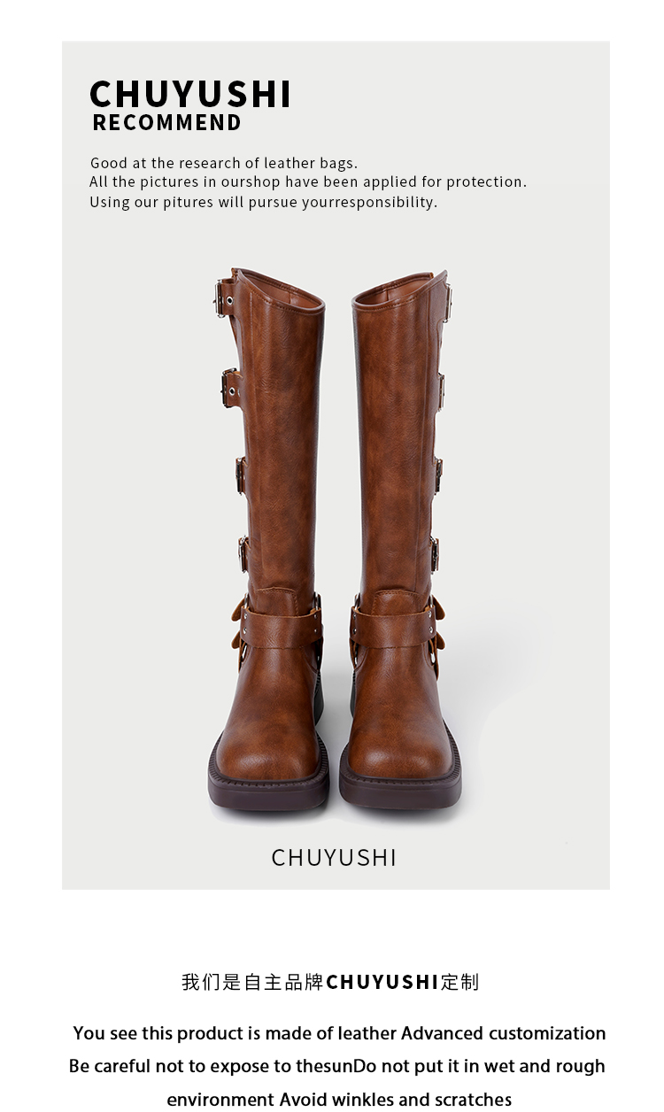 CHUYUSHI 棕色长筒靴女复古百搭扣搭套筒机车骑士靴西部牛仔靴子