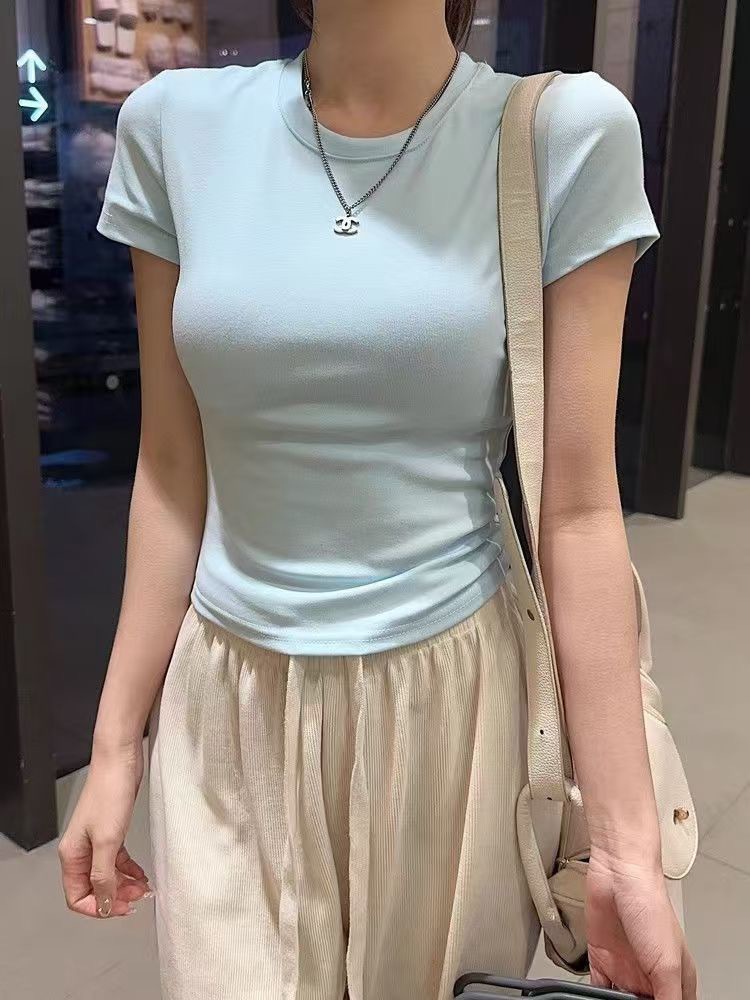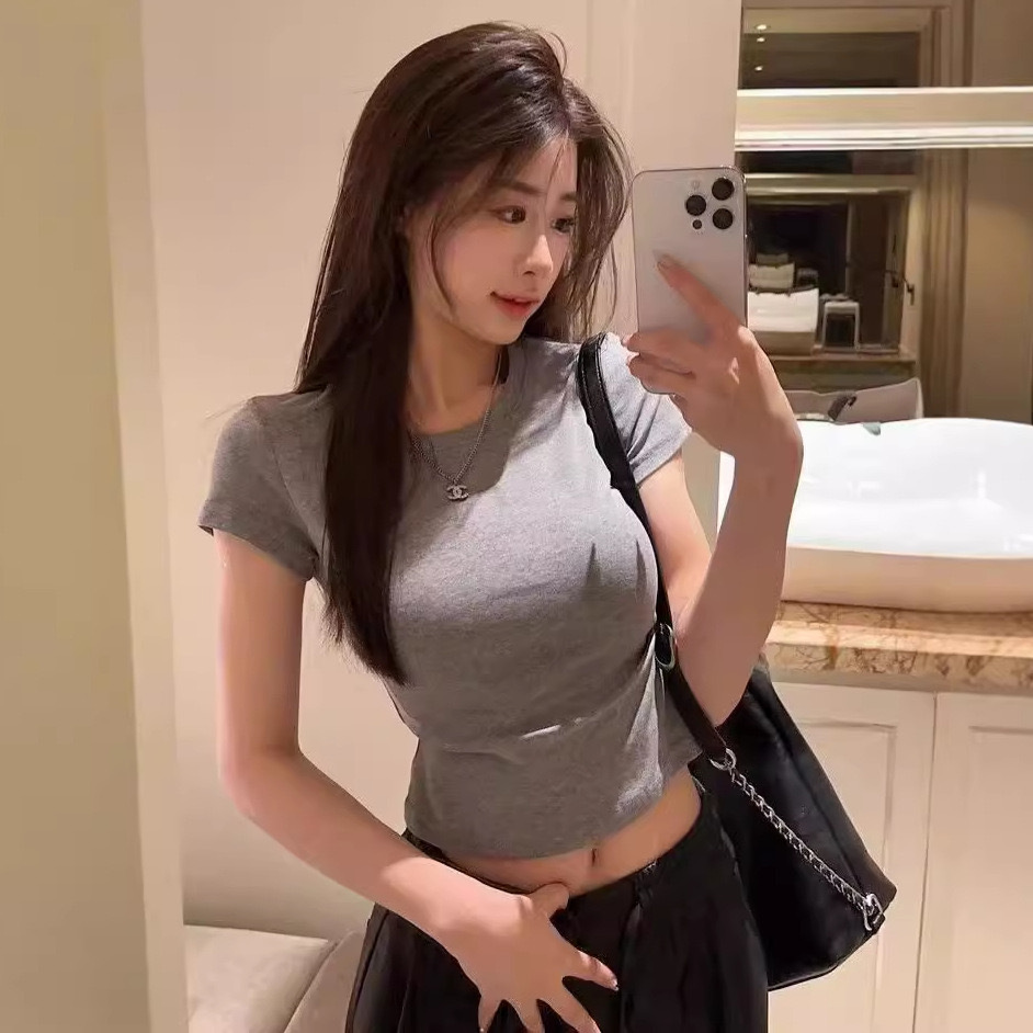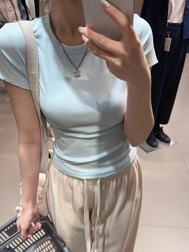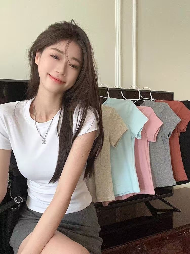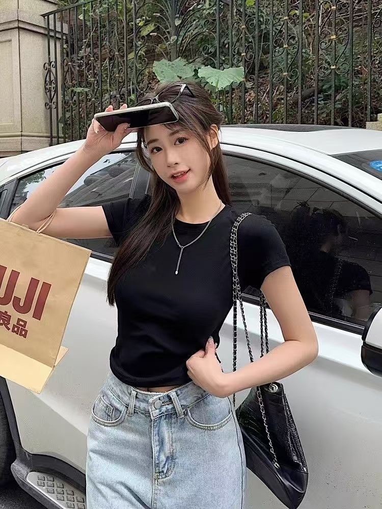 2025春秋新款外贸白色短袖t恤女打底衫女装韩版修身辣妹内搭上衣